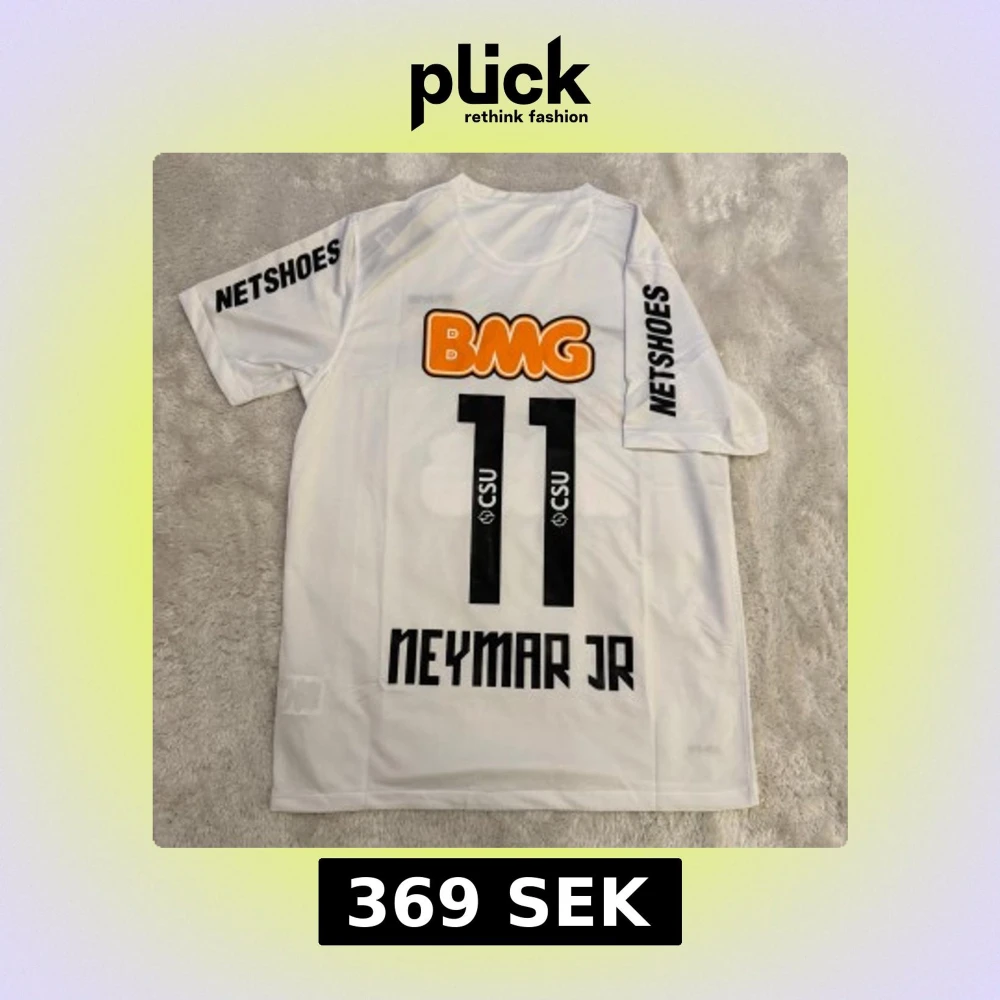 Snygg vit fotbollströja från Nike med Santos FC klubbmärke, Neymar Jr och nummer 11 på ryggen. Tröjan har korta ärmar, svart Nike-logga och flera tryck i orange och svart. Materialet är lätt och andas, perfekt för match eller träning.
