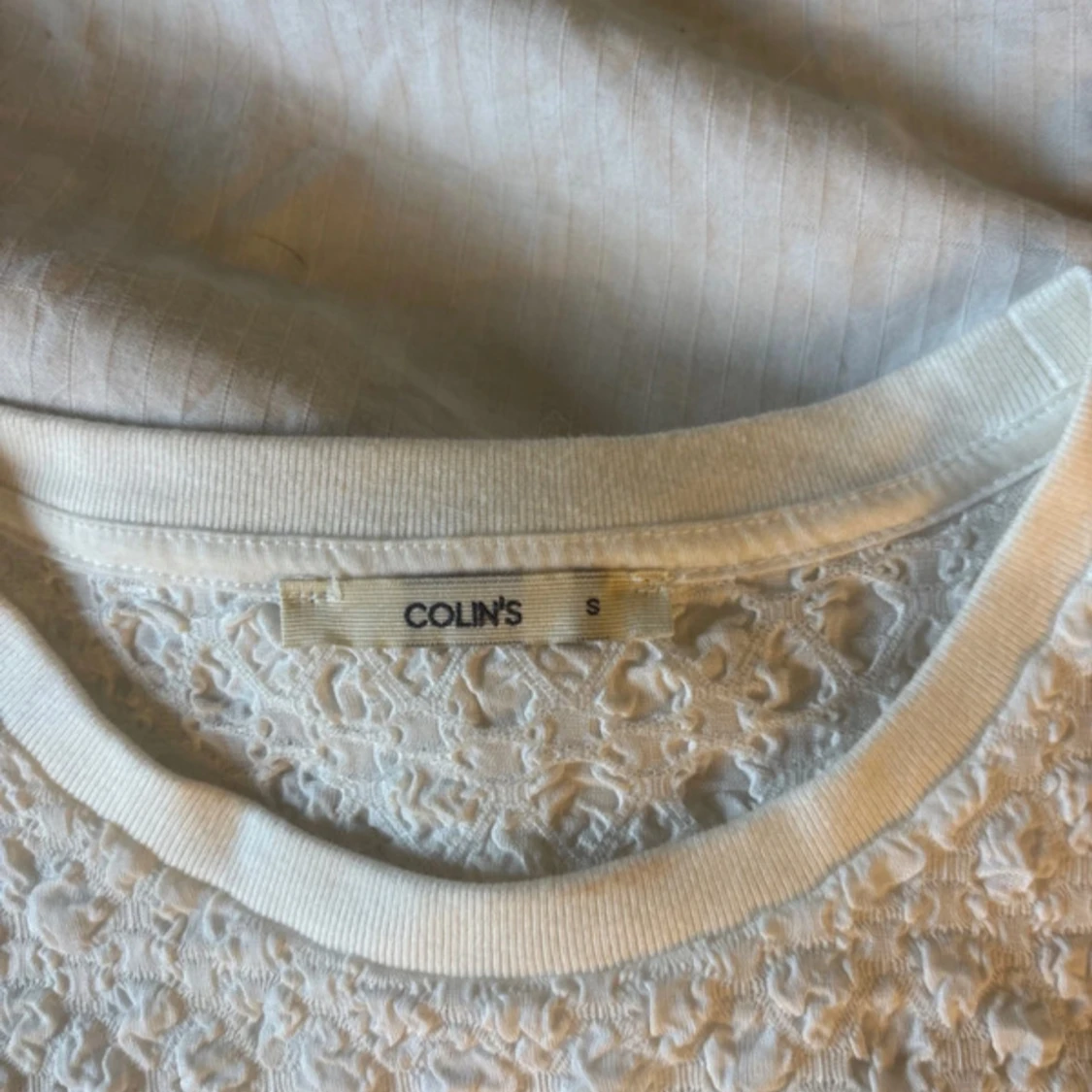 Supersöt vit t-shirt från Colin's med korta ärmar och ett unikt spetsliknande mönster över hela tyget. Rund halsringning med ribbad kant. Perfekt för dig som gillar en romantisk och fräsch stil.