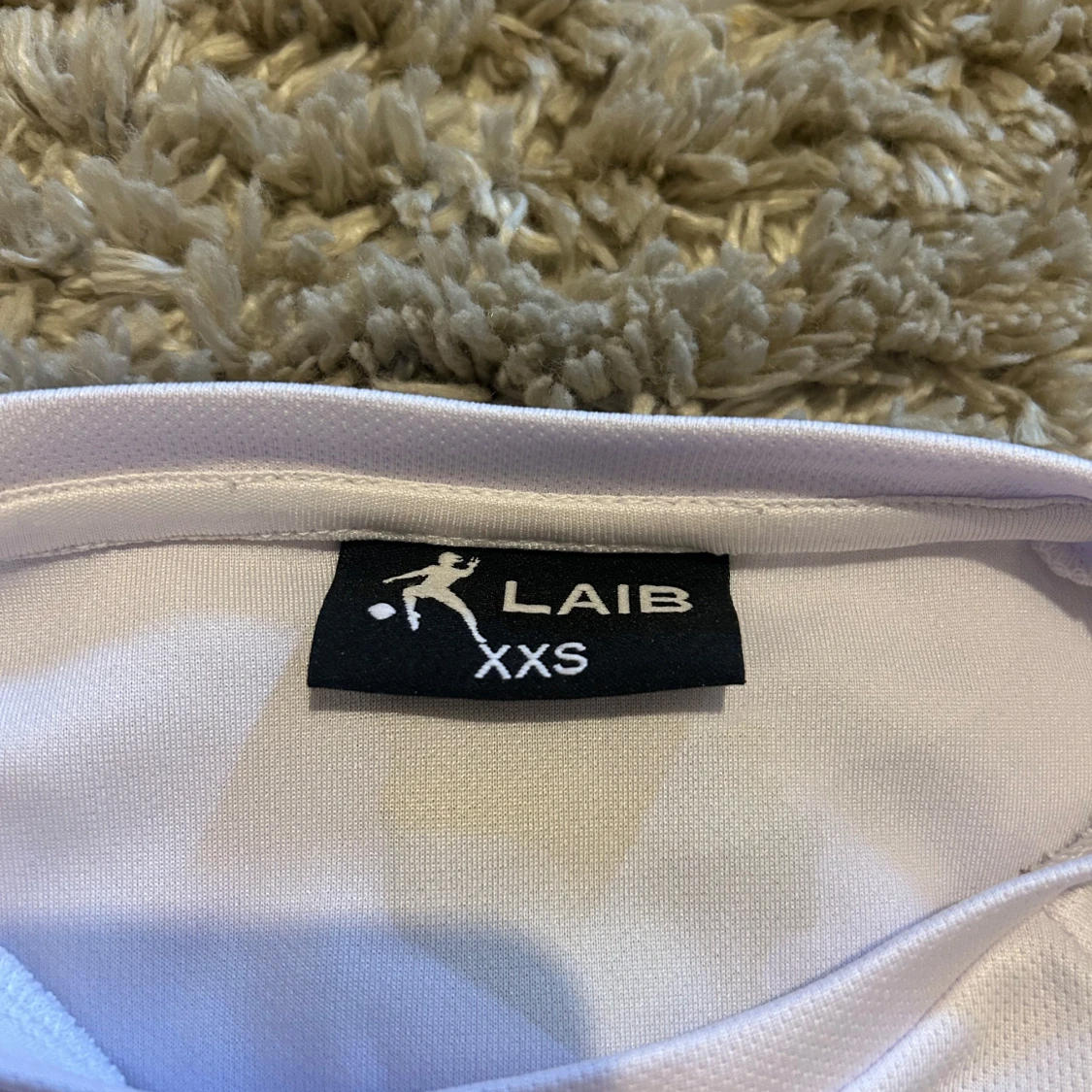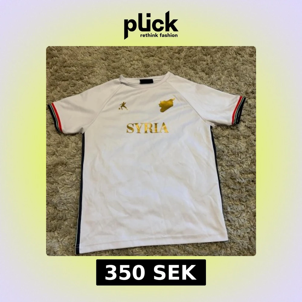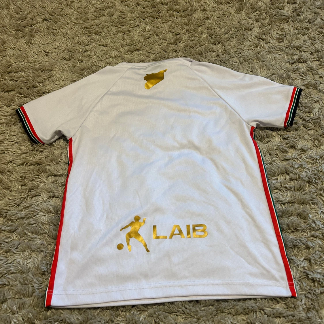 Vit fotbollströja från LAIB i storlek XXS med guldiga tryck, bland annat texten SYRIA och en siluett av Syrien. Tröjan har korta ärmar med röd, svart och grön rand på mudden. Materialet är lätt och andas, perfekt för träning eller match.