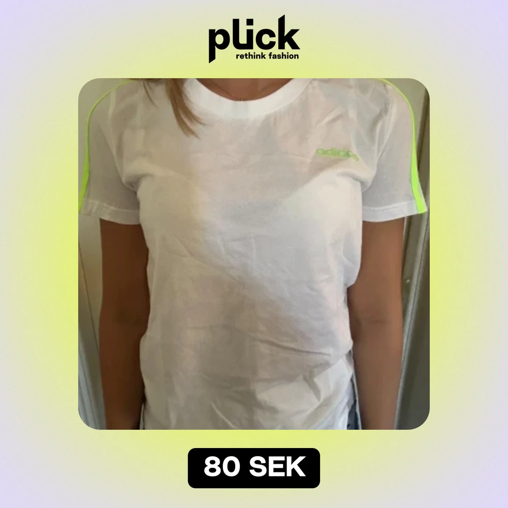 Säljer en snygg vit t-shirt från Adidas med neongröna detaljer. Den har korta ärmar och en slim passform, perfekt för en sportig look. T-shirten är i nyskick och har fortfarande prislappen kvar.