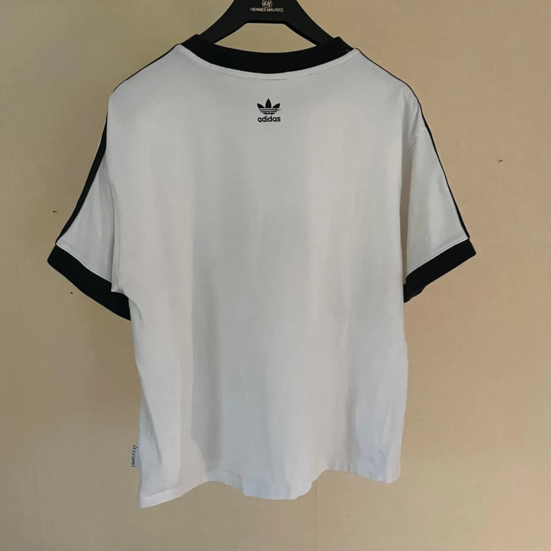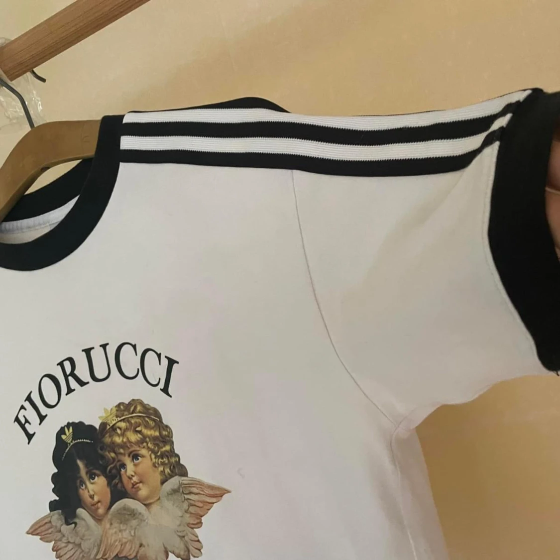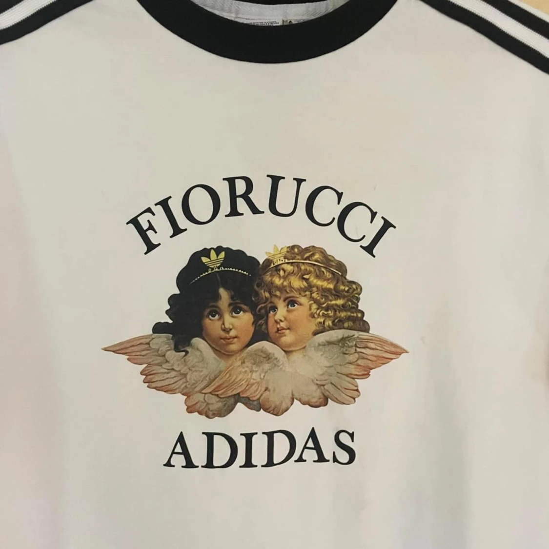 En vit t-shirt från Adidas och Fiorucci med ett tryck av två änglar på framsidan. T-shirten har svarta detaljer vid kragen och ärmsluten samt svarta ränder längs ärmarna.