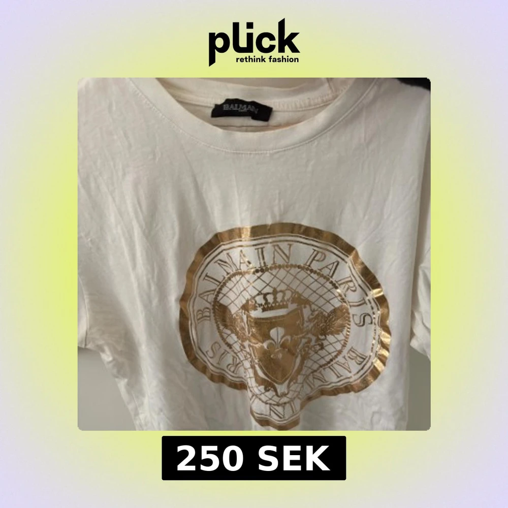 Säljer en stilren vit t-shirt från Balmain med ett iögonfallande guldtryck på framsidan. T-shirten har en klassisk rund hals och korta ärmar. Perfekt för dig som vill ha en touch av lyx i vardagen.