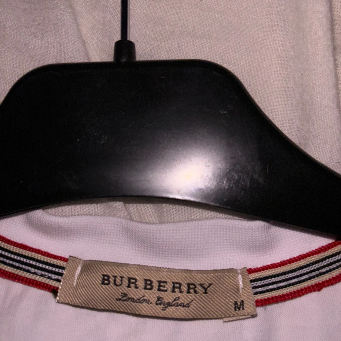 Säljer en snygg vit t-shirt från Burberry med texten 'BURBERRY LONDON ENGLAND' på bröstet. T-shirten är i storlek M och har korta ärmar. Perfekt för en casual look eller att klä upp med en snygg jacka. Passar till alla tillfällen!