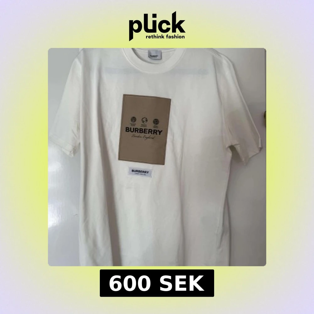 Säljer en stilren vit t-shirt från Burberry med ett stort beige tryck på framsidan. T-shirten är kortärmad och tillverkad i 100% bomull, vilket gör den bekväm och perfekt för vardagsbruk. Klassisk design med Burberrys logotyp och texten 'London, England'. Sommar Vibe
