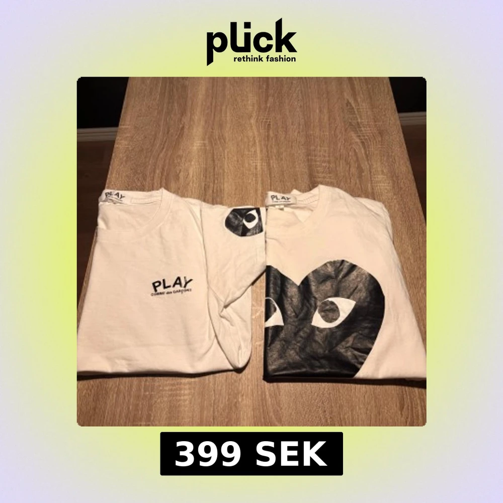 Säljer två vita t-shirts från Comme des Garçons Play med det ikoniska hjärtmotivet och logga på bröstet. En har stort svart hjärta med ögon, den andra har liten logga och hjärtdetalj på ärmen. Perfekt för en stilren och trendig look. OBS:1 FÖR 399 2 FÖR 799