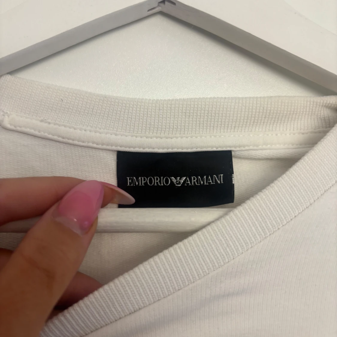 Snygg vit tröja från Emporio Armani med klassisk rund hals och svart broderad logga framtill. T-shirten är i mjuk bomull och har en clean, stilren look som passar perfekt till jeans eller shorts.
