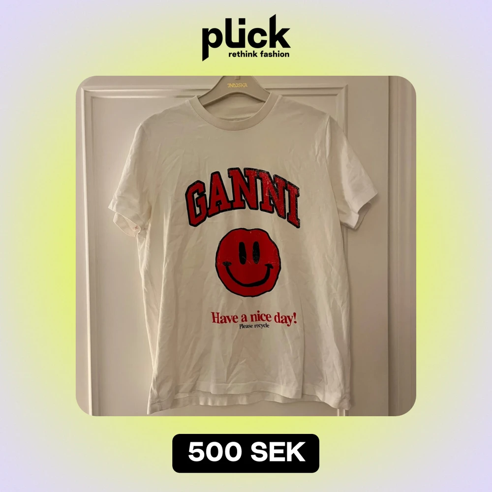 Vit t-shirt från Ganni som är mycket sparsamt använd, fint skick, dock några smink fläckar på ”kragen” (se bild) 🩵