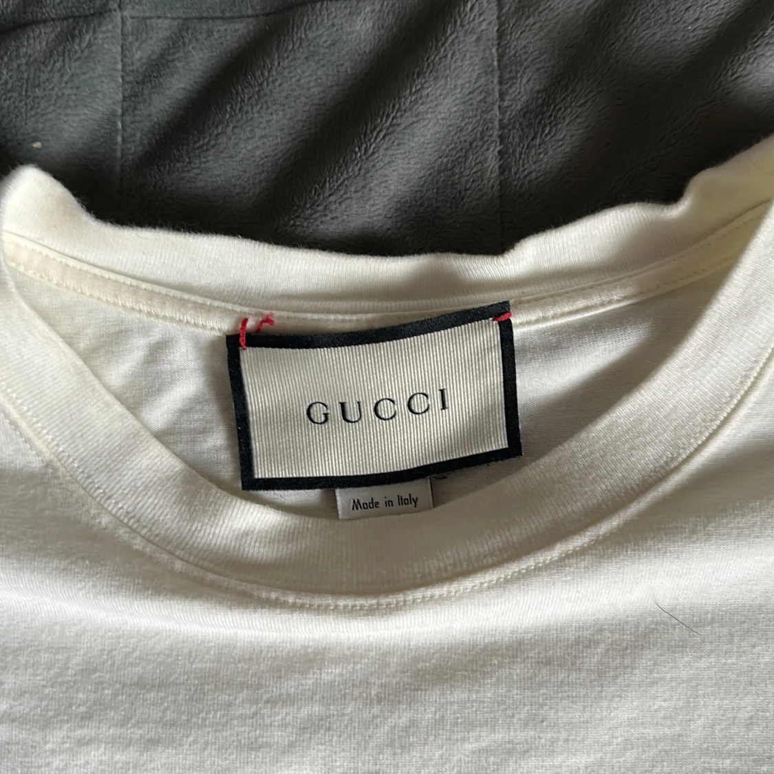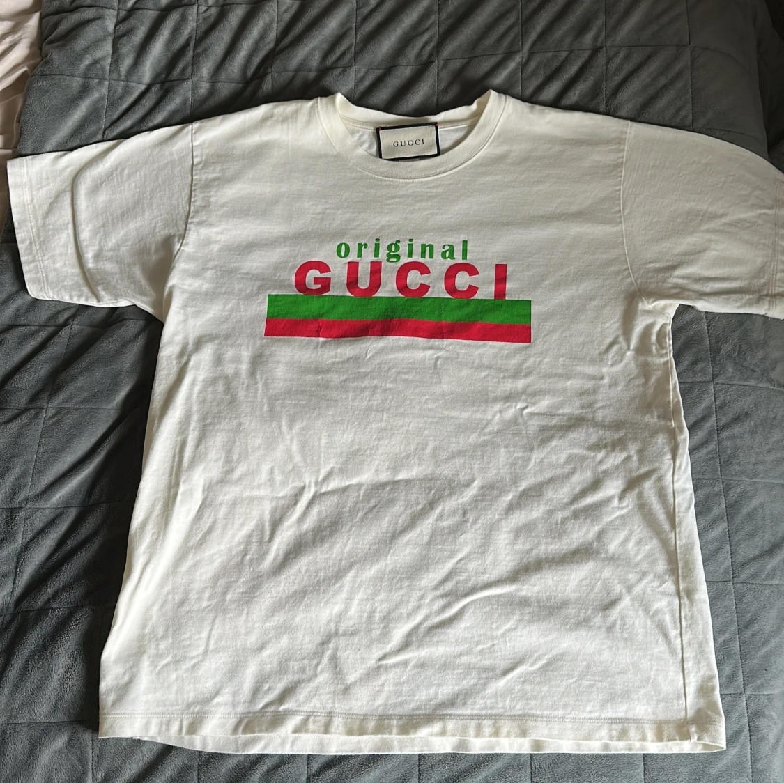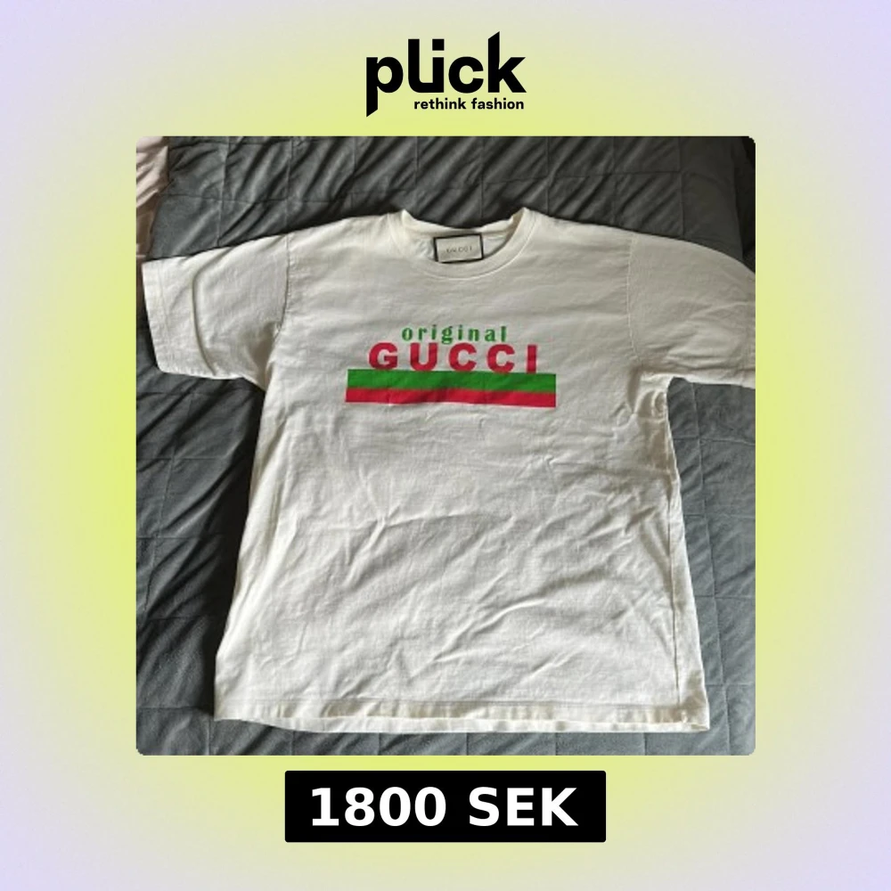 Säljer en vit t-shirt från Gucci med tryck i rött och grönt. T-shirten har korta ärmar och en klassisk rund halsringning. Perfekt för en stilren och lyxig look. Storleken är M