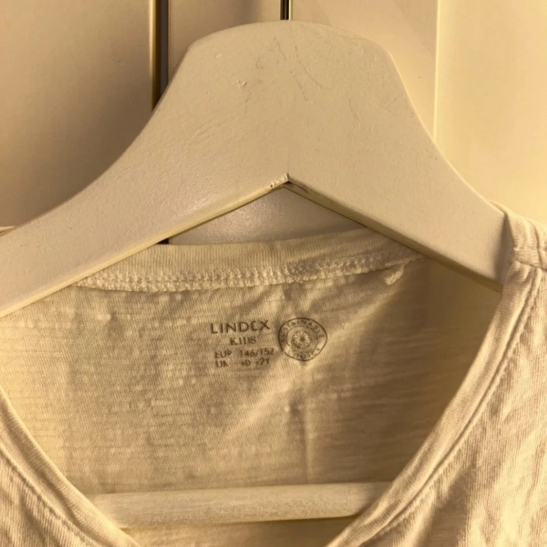 Säljer en klassisk vit t-shirt från Lindex i storlek 146/152. Den har en enkel design med korta ärmar och rund halsringning. Perfekt basplagg för alla tillfällen.
