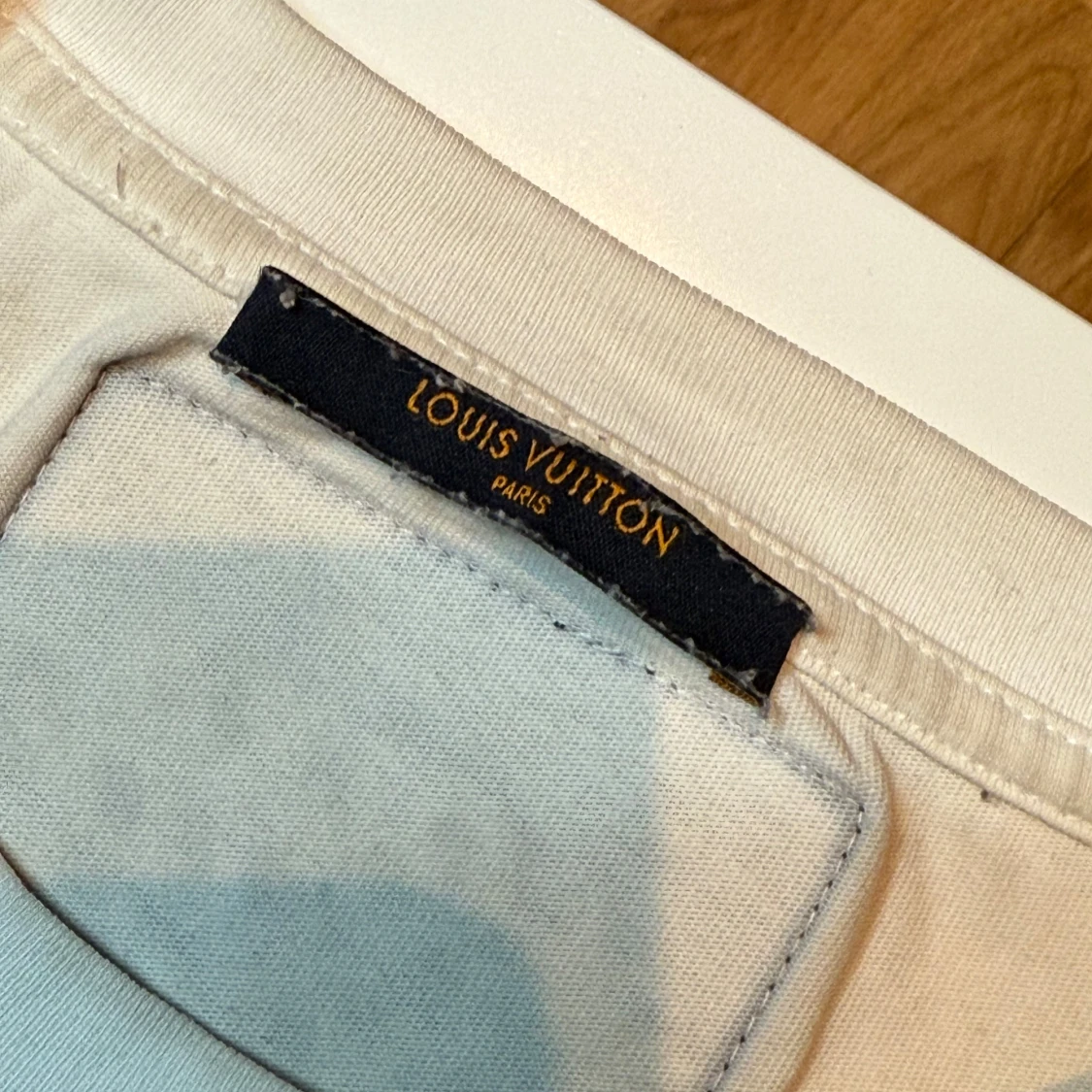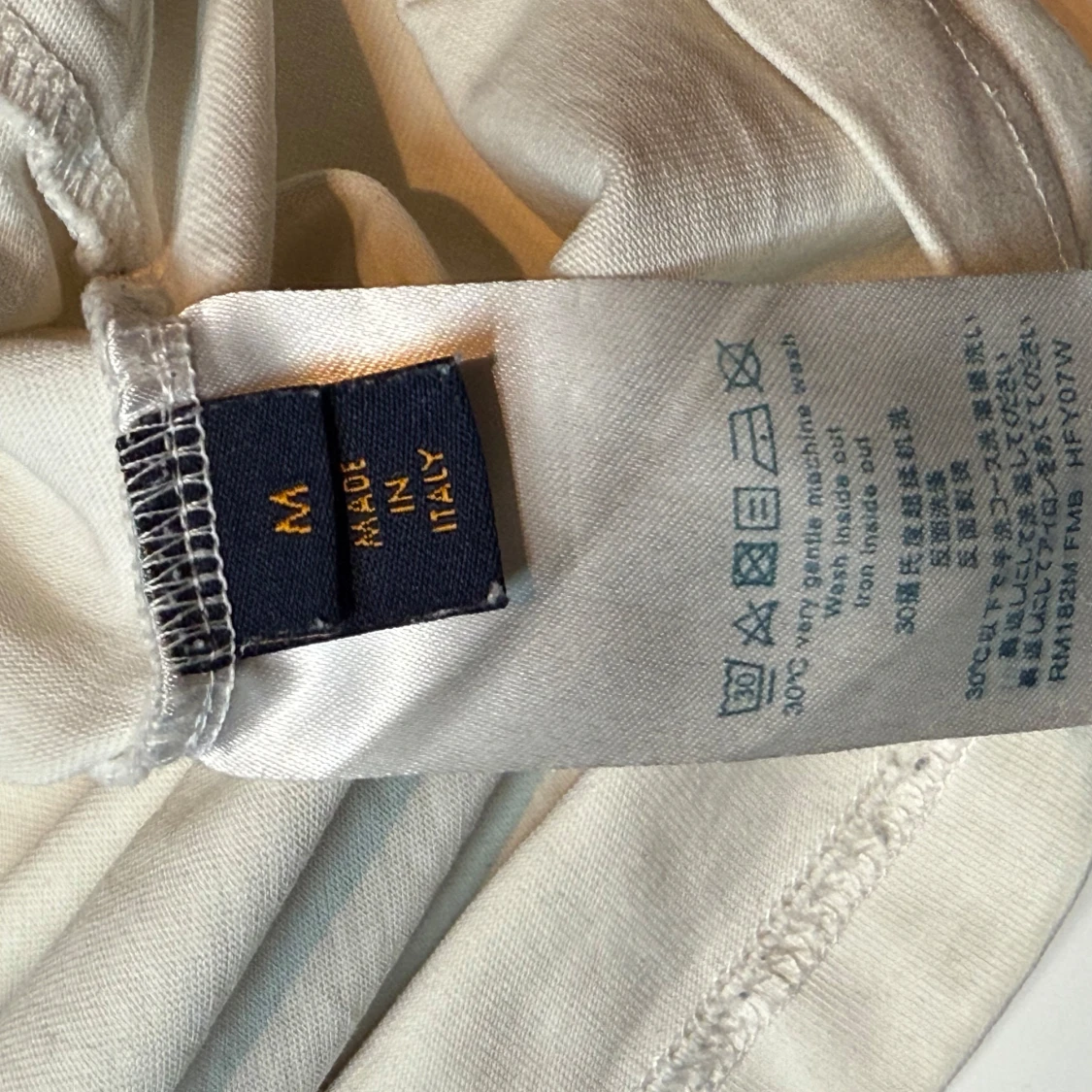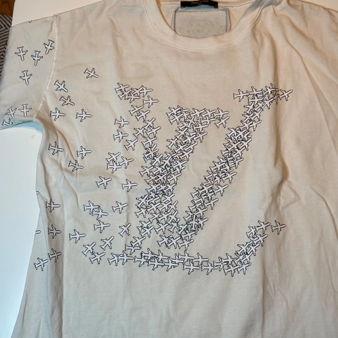 Säljer en vit t-shirt från Louis Vuitton med ett unikt mönster av små flygplan som bildar ett stort 'LV' på framsidan. T-shirten är kortärmad och tillverkad i Italien. Perfekt för den som vill ha något exklusivt och stilrent.