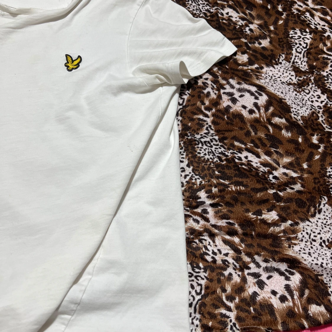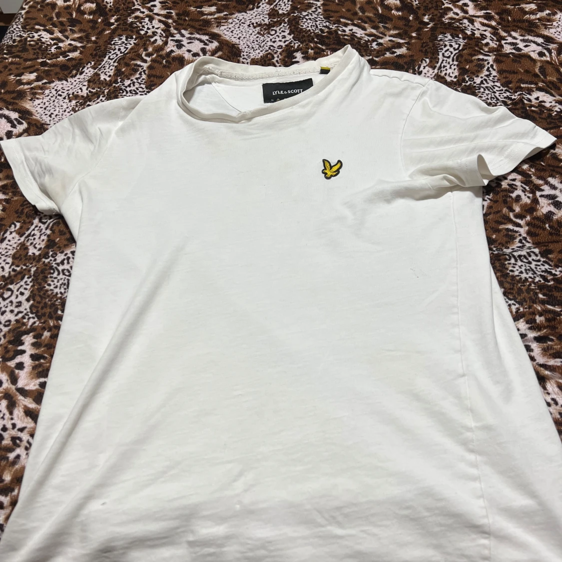 Säljer en klassisk vit t-shirt från Lyle & Scott med korta ärmar och en broderad gul logotyp på bröstet. Perfekt för en stilren och enkel look.