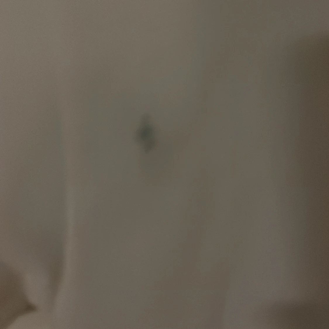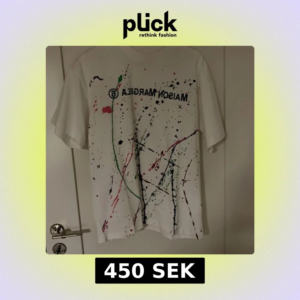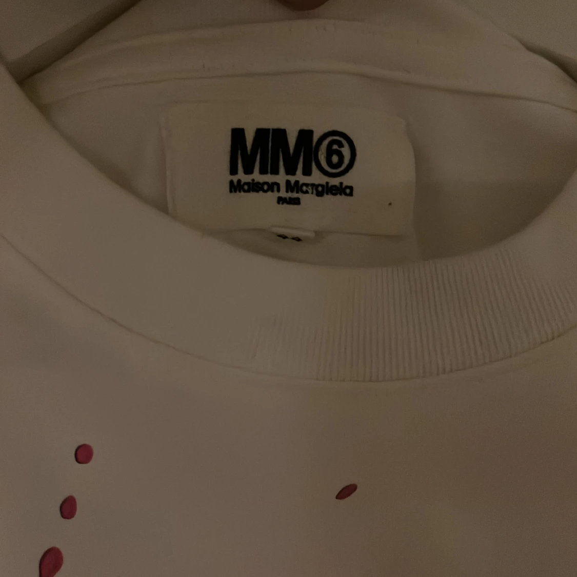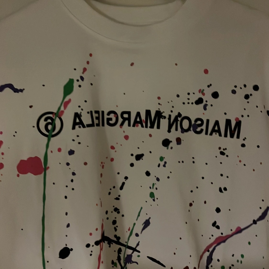 Snygg vit t-shirt från Maison Margiela med färgstänk i grönt, rött och svart. Den har en avslappnad passform och korta ärmar. Perfekt för en trendig och avslappnad look.Den har en liten fläck på bak vänster axel. Den är från 🐼