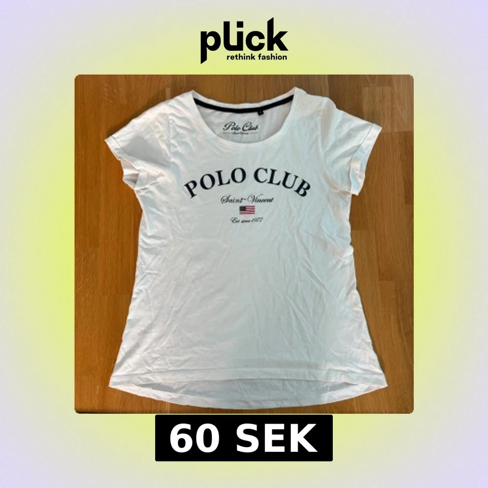 Vit t-shirt från Polo Club Saint Vincent med svart tryck framtill. Det är storlek S. Som man kan se på bild 1 och bild 4 så finns det en liten liten fläck som inte syns så jättemycket. Ska försöka få bort fläcken i tvätten och sen stryka tröjan! Så ha det i åtanke ifall jag inte får bort de.