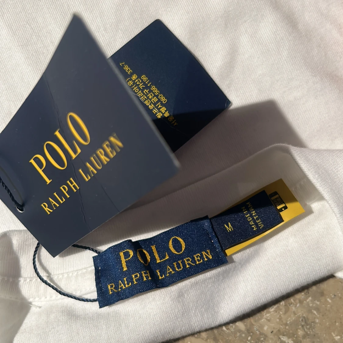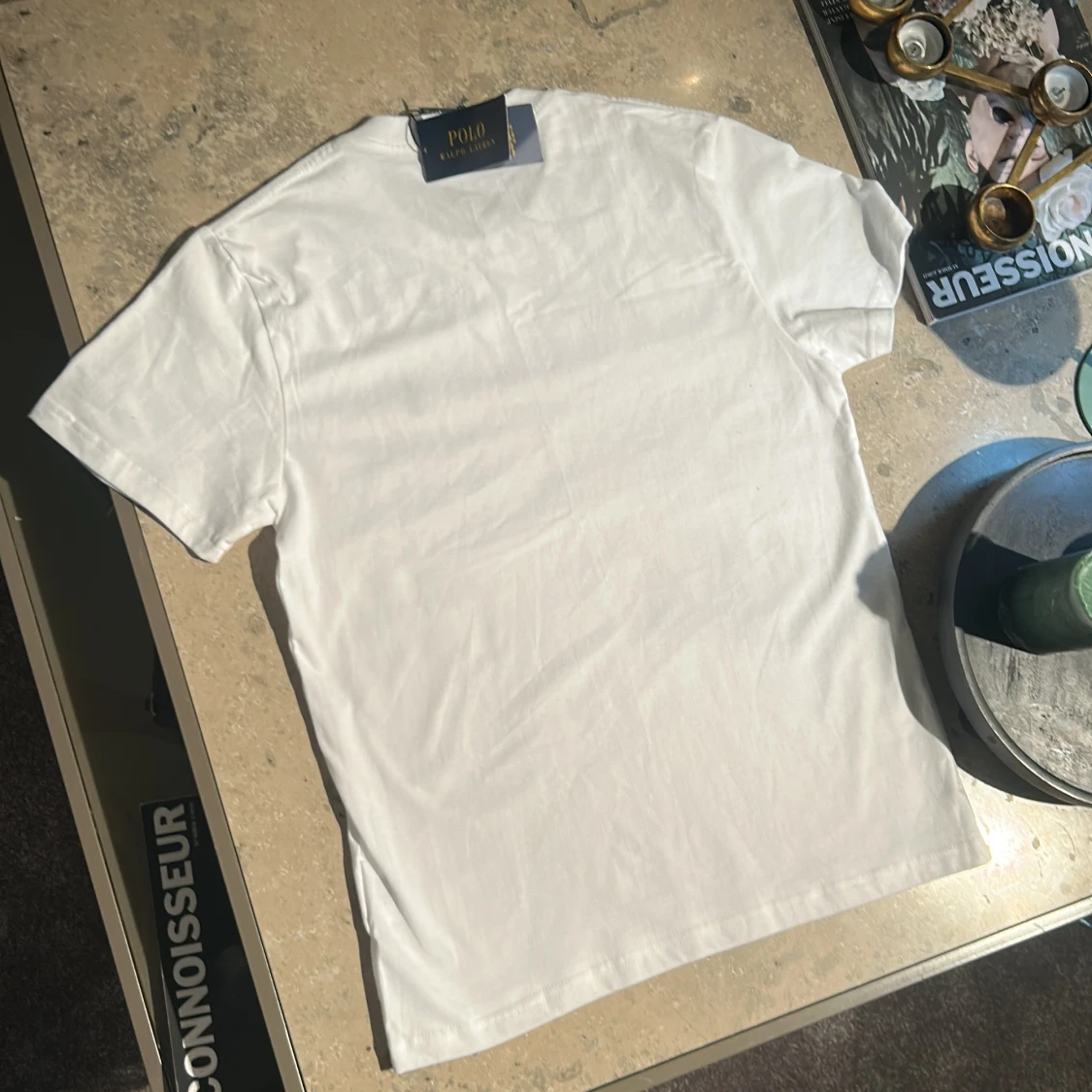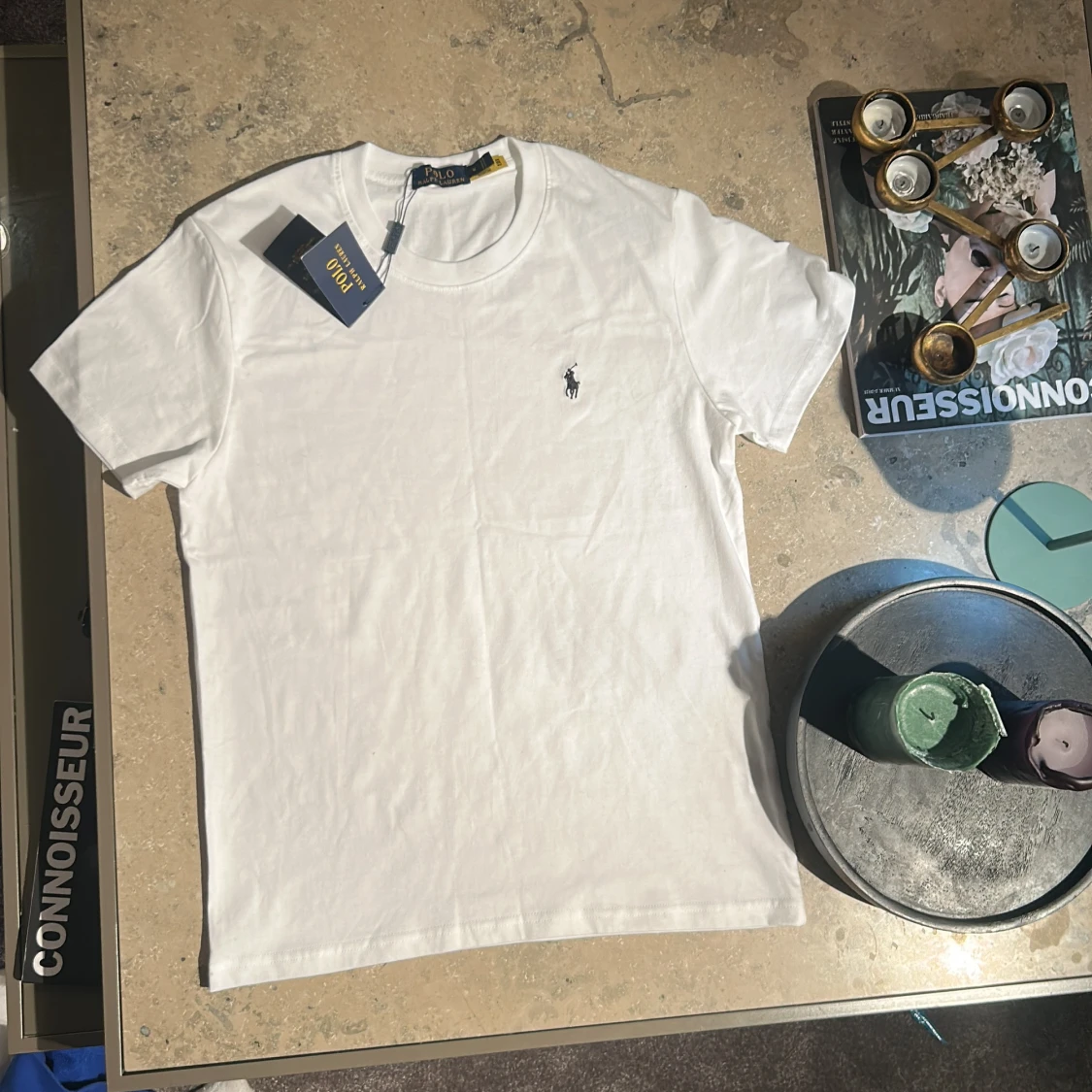 Helt ny oanvänd MED PRISLAPP/tag.Klassisk vit t-shirt från Polo Ralph Lauren med broderad svart logga på bröstet. T-shirten har rund hals, korta ärmar och är gjord i mjuk bomull. Perfekt basic-plagg med snygg passform och stilren look.