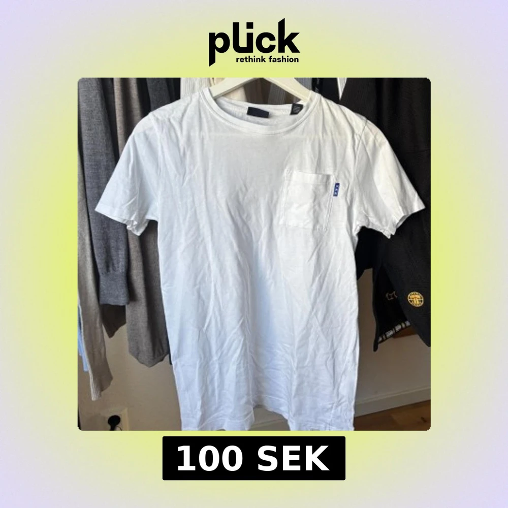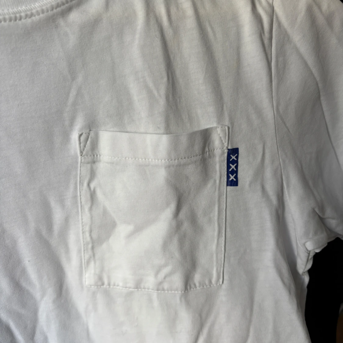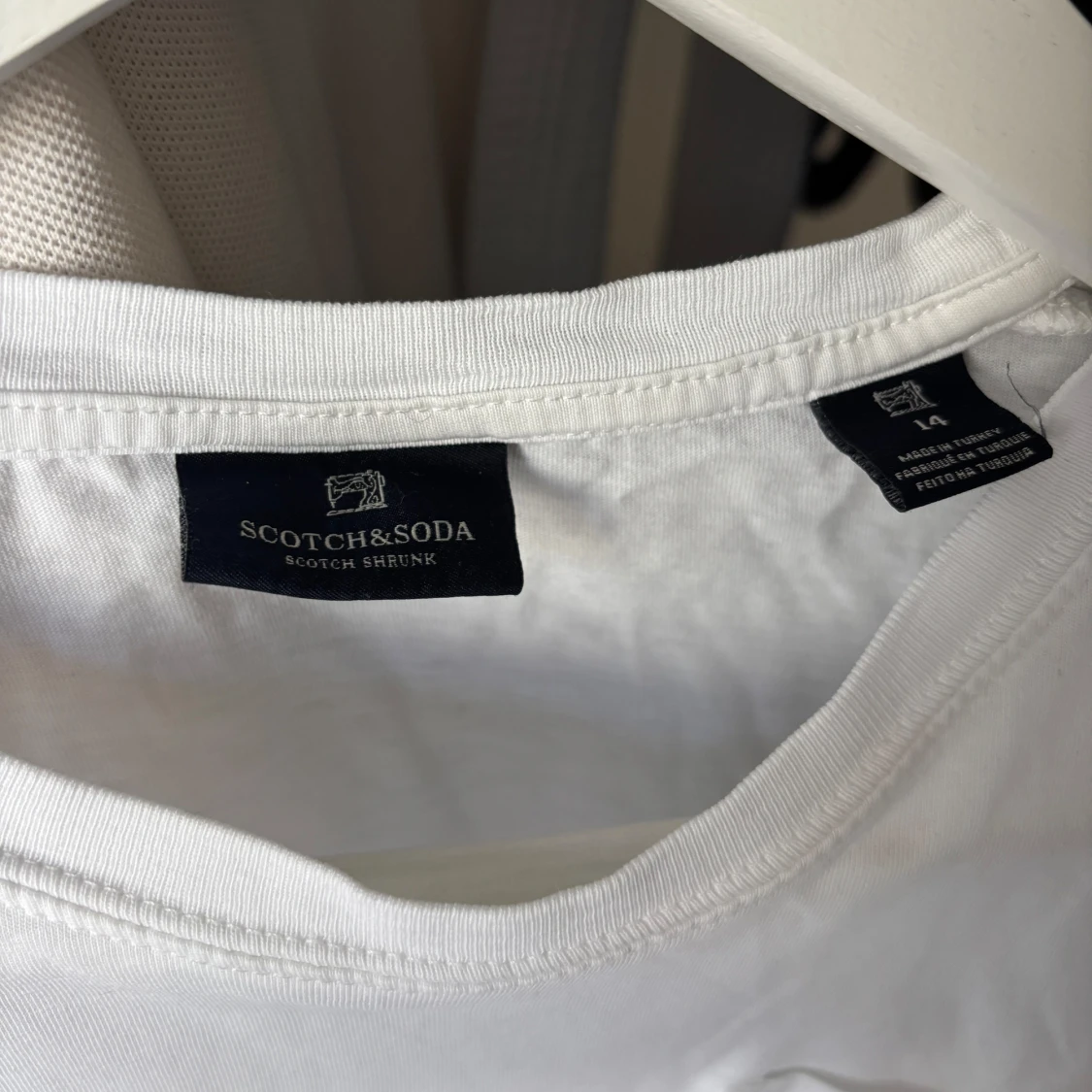 Säljer en stilren vit t-shirt från Scotch & Soda med en liten bröstficka och blå detalj. Perfekt för en avslappnad look.