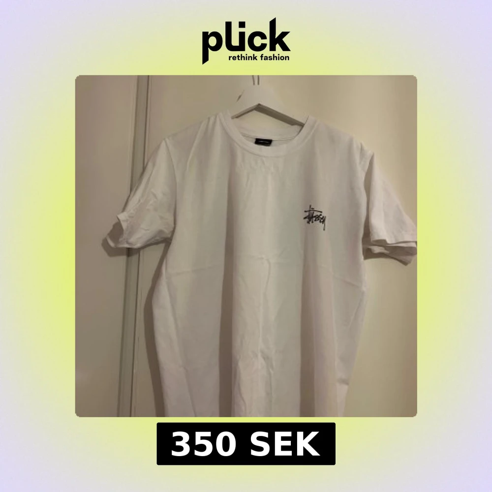 Säljer en klassisk vit t-shirt från Stussy med deras ikoniska logga tryckt på bröstet. T-shirten har en rund halsringning och korta ärmar, perfekt för en avslappnad stil.