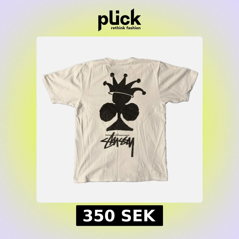 vit t-shirt från Stüssy med ett stort svart tryck på baksidan och en mindre logga på framsidan