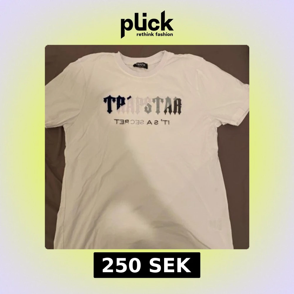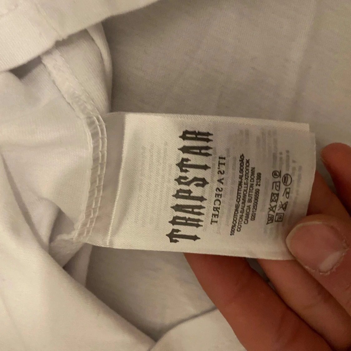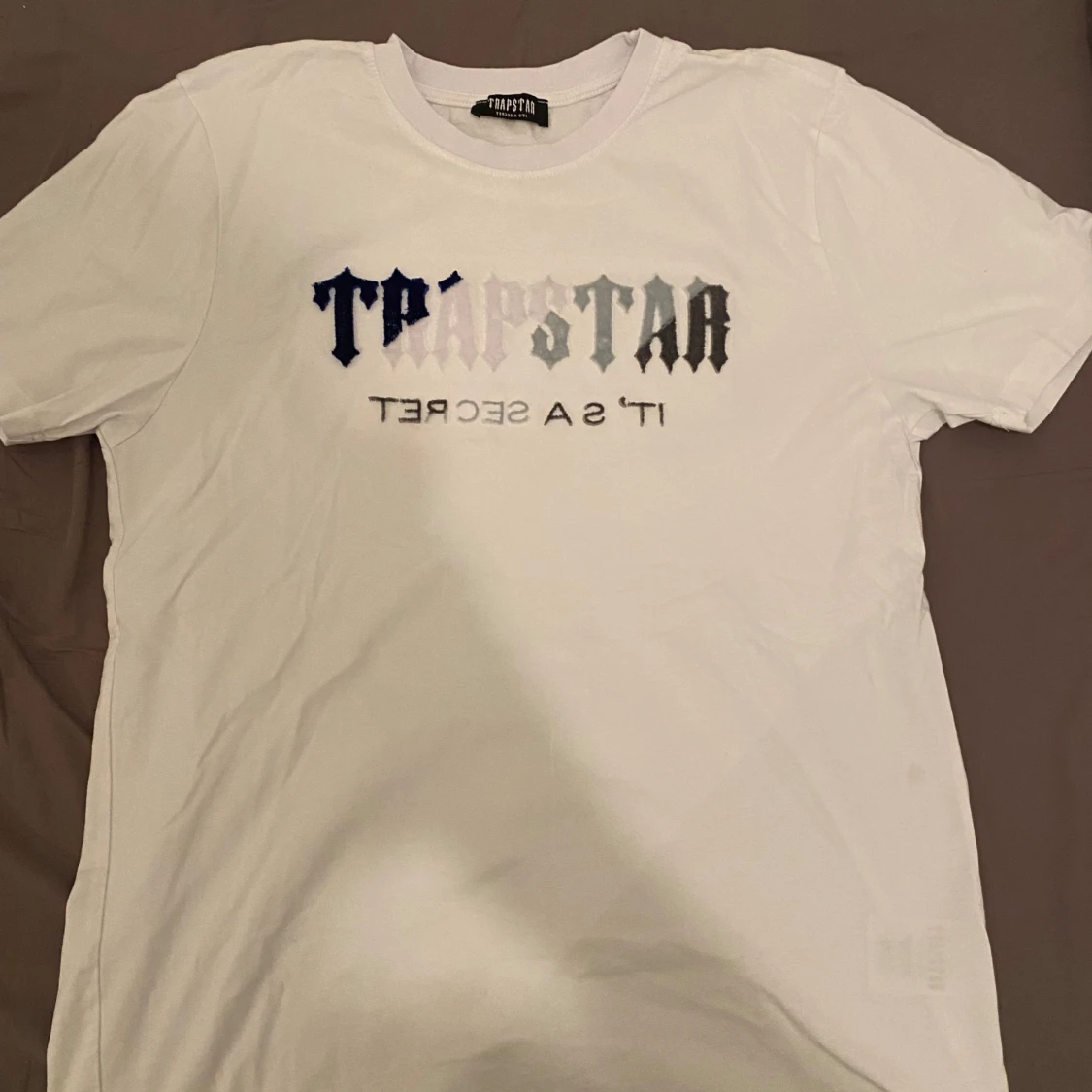 Säljer en vit t-shirt från Trapstar med tryck i svart och grått på framsidan. T-shirten har en klassisk rund hals och korta ärmar. Perfekt för en avslappnad stil.