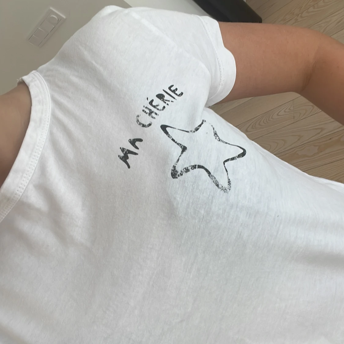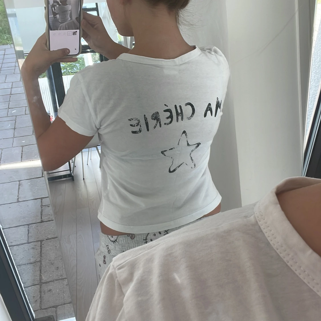Vit t-shirt från Gina Tricot med svart tryck 'MA CHÉRIE' och en stjärna på bröstet och ryggen. Modellen är kortärmad och har en klassisk rund hals. T-shirten är i mjuk bomull och har en clean, enkel vibe.🩶🤍