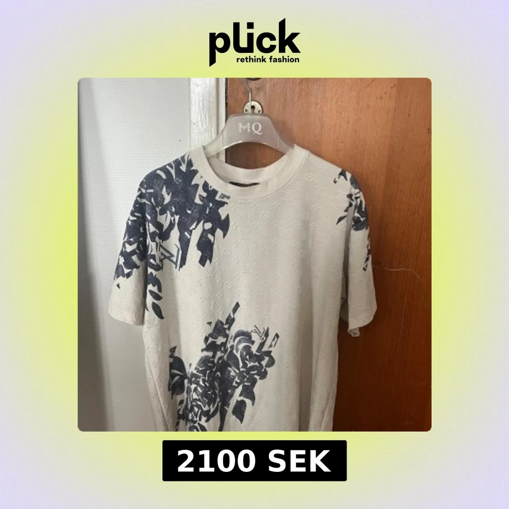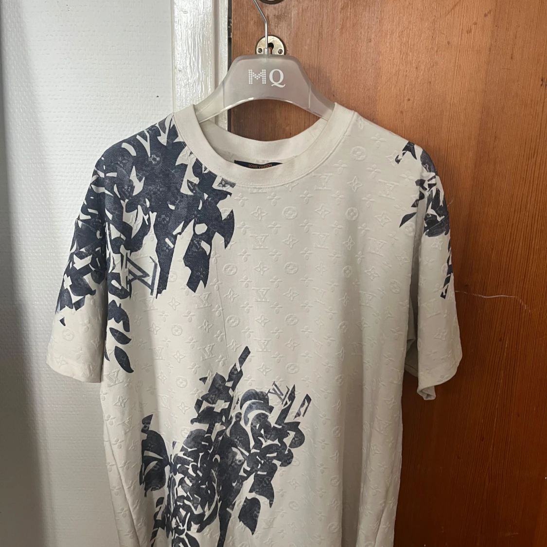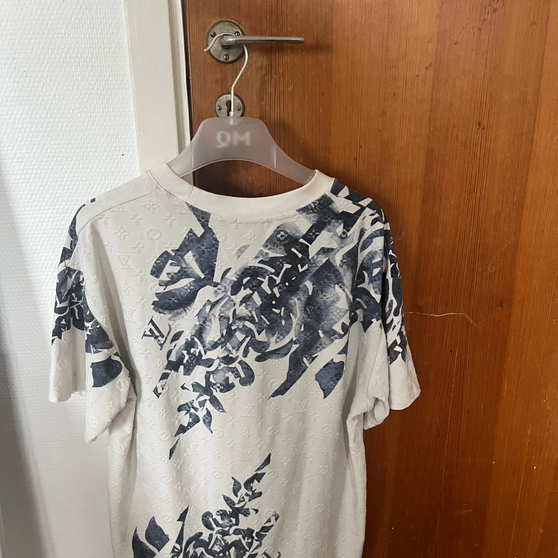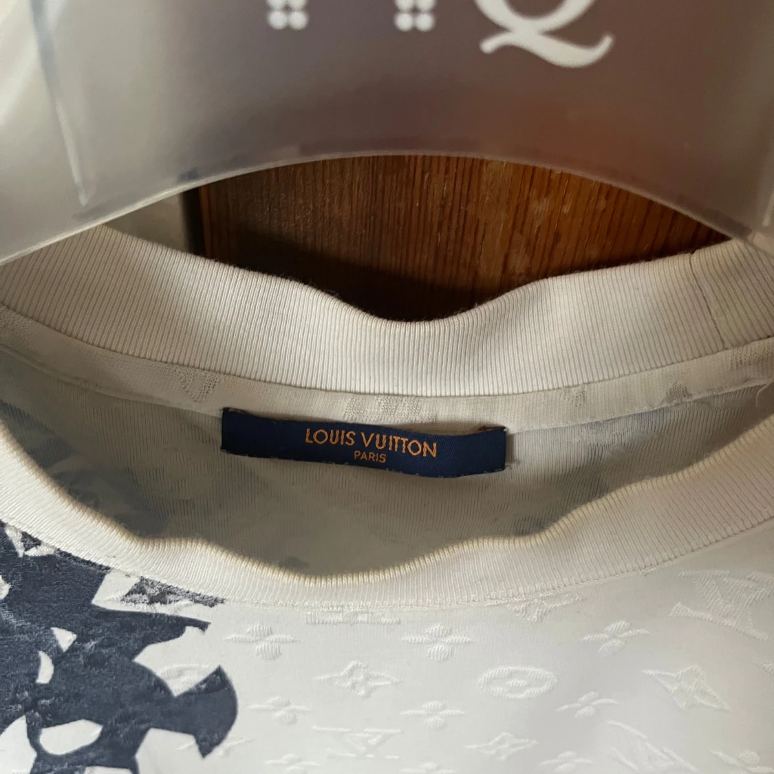 Exklusiv vit t-shirt från Louis Vuitton med subtilt monogrammönster i tyget och stora mörkblå grafiska detaljer. Klassisk passform, rund hals och korta ärmar. Tillverkad i Italien i mjuk bomull. Perfekt för dig som vill sticka ut med stil inget kvitto och därav priset.