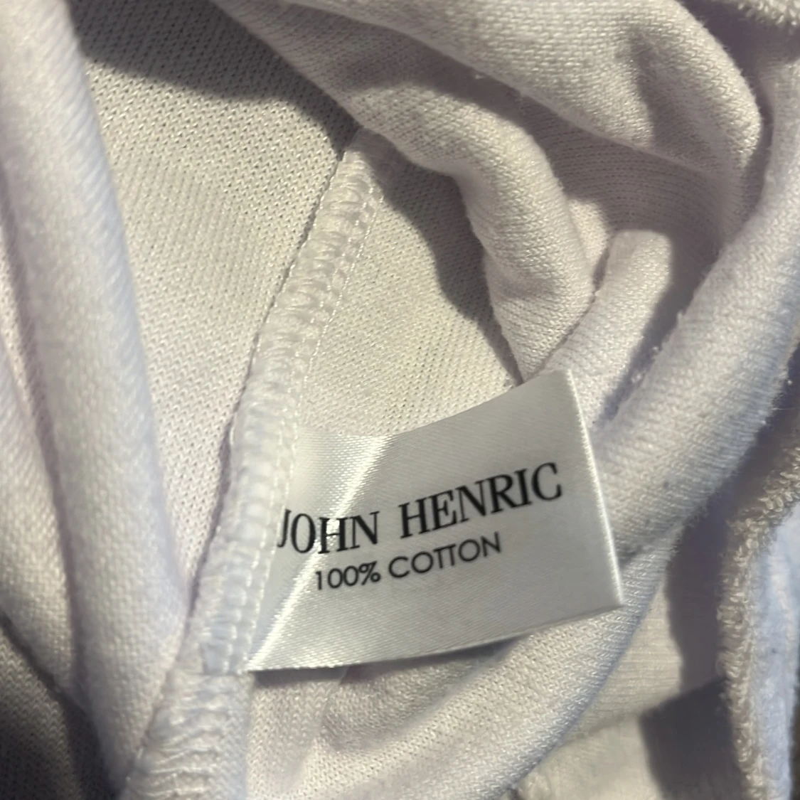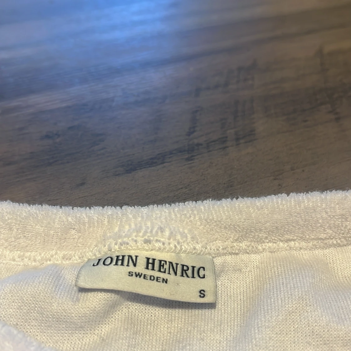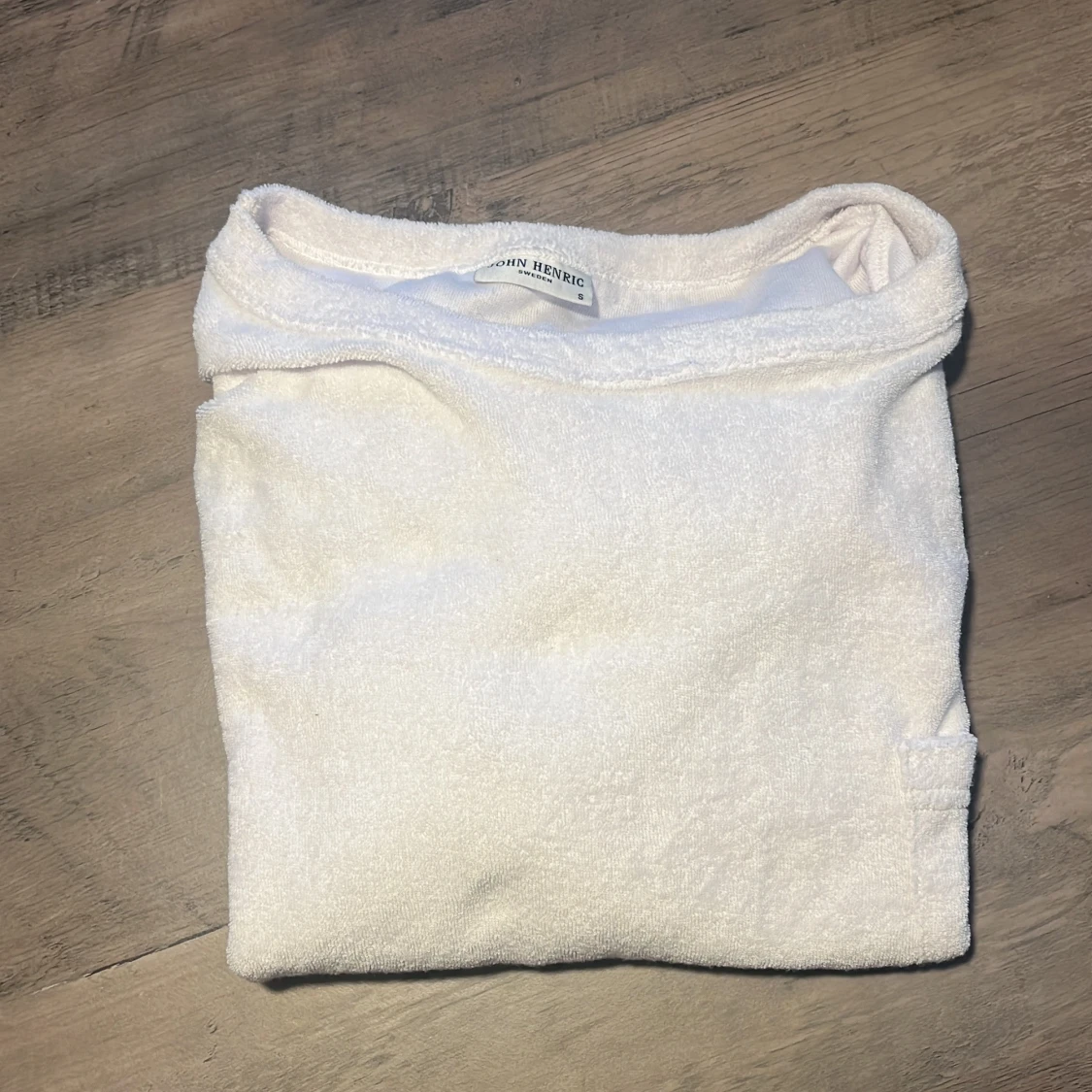 Säljer en klassisk vit froté t-shirt från John Henric i 100% bomull. T-shirten har korta ärmar och en liten bröstficka på vänster sida. Perfekt basic-plagg till garderoben.