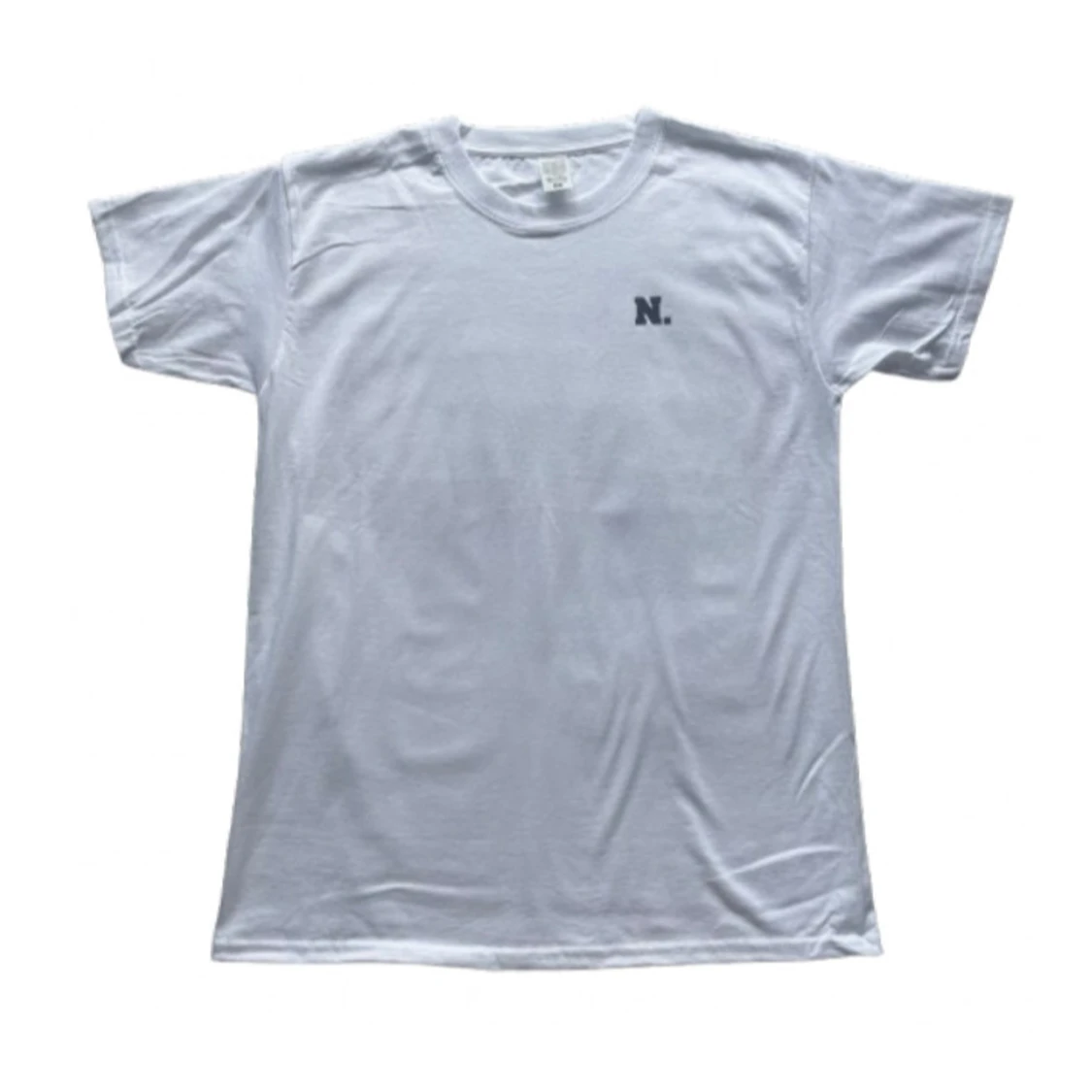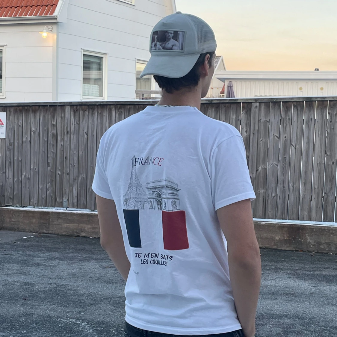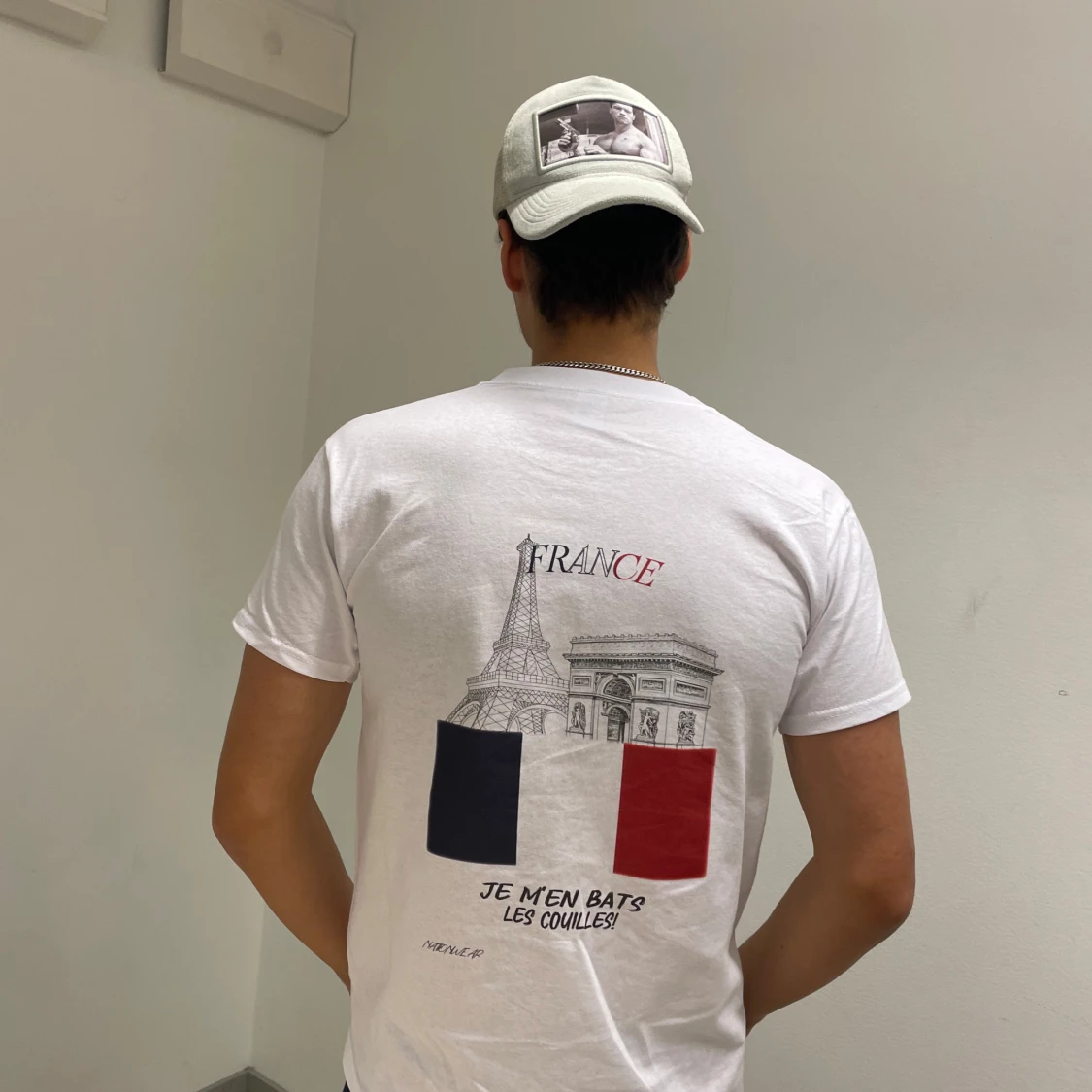 Säljer en vit t-shirt med tryck av Eiffeltornet och Triumfbågen på baksidan. Texten 'FRANCE' och 'JE M'EN BATS LES COUILLES' finns också. Framsidan har en liten logga 'N.' på bröstet. Perfekt för en avslappnad stil!