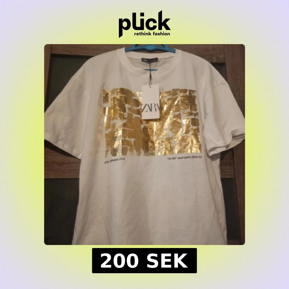 Vit t-shirt från Zara med ett stort, glansigt guldtryck framtill i ett abstrakt mönster. Modellen är klassisk med rund hals och korta ärmar. Materialet är mjuk bomull och passformen är loose för en chill vibe.