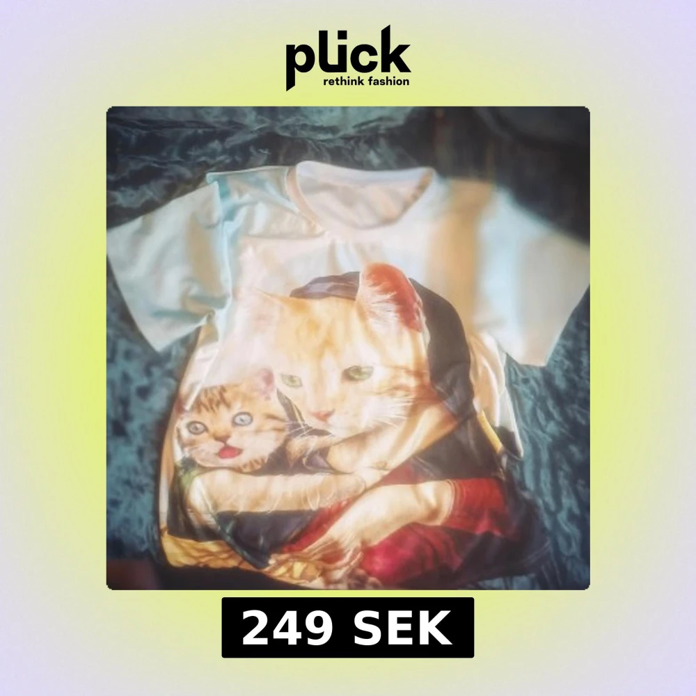 Vit t-shirt med ett stort, färgglatt tryck av två katter i konstnärlig stil på framsidan. T-shirten har rund hals och korta ärmar. Perfekt för dig som älskar katter och vill sticka ut med en unik och rolig design.