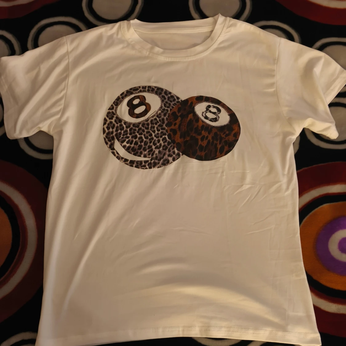 Vit t-shirt med coolt tryck av två biljardbollar med leopardmönster på bröstet. Klassisk rund hals och korta ärmar. Materialet känns mjukt och är troligtvis bomull, perfekt för dig som gillar unika och djuriska detaljer.