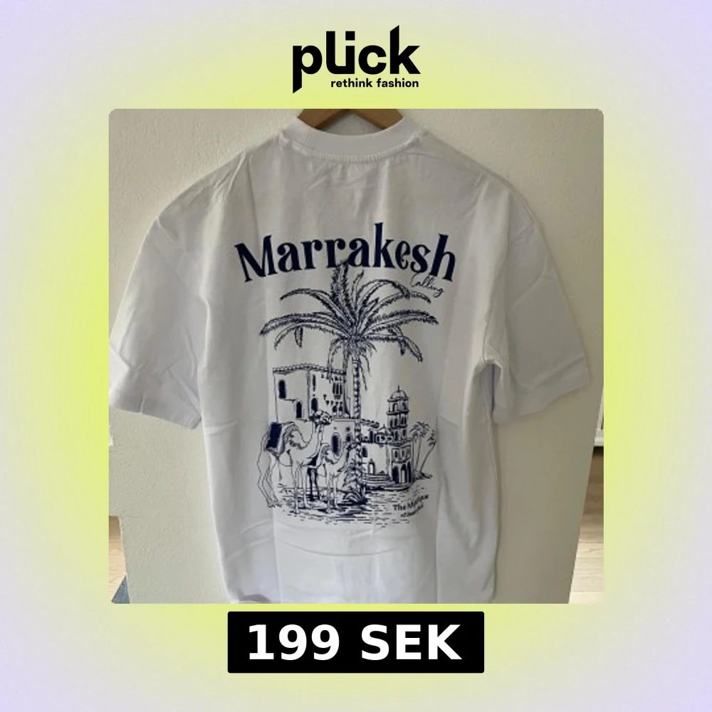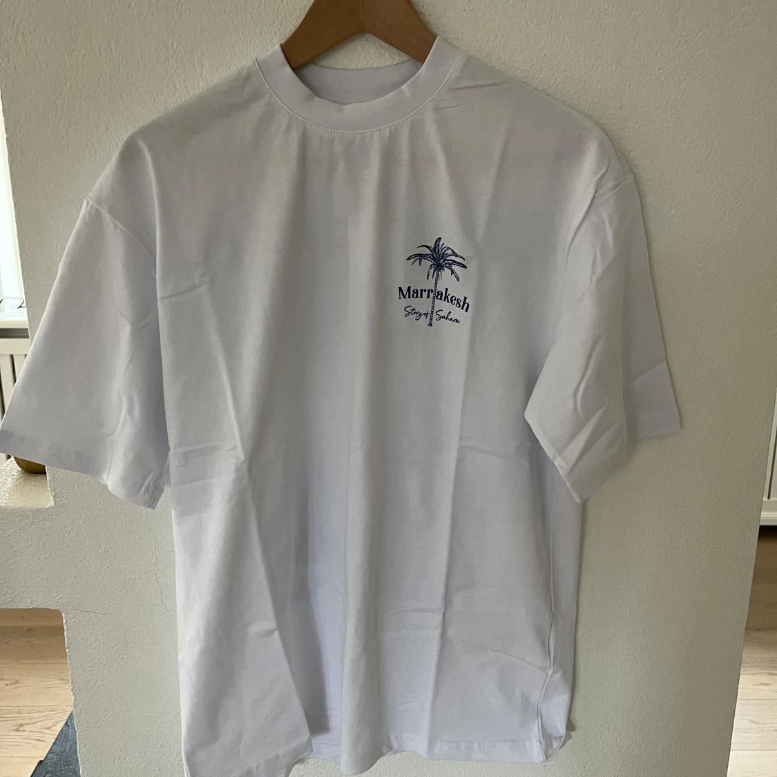 Säljer en vit t-shirt från YOURTURN med ett stort blått Marrakesh-tryck på baksidan och en mindre logga på framsidan. T-shirten är riktigt stilren och passar bra inför sommaren😁Tröjan är XS men passar S