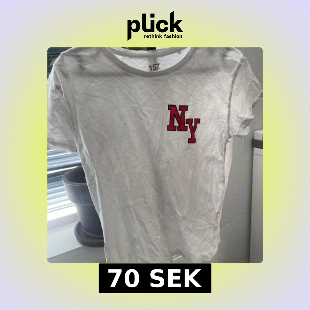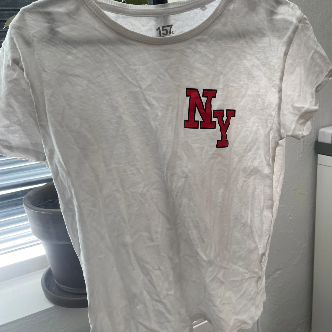 Vit t-shirt från 157 med rött NY-tryck på bröstet. Klassisk rund halsringning och korta ärmar. Tillverkad i 100% bomull, perfekt för en avslappnad och enkel stil.