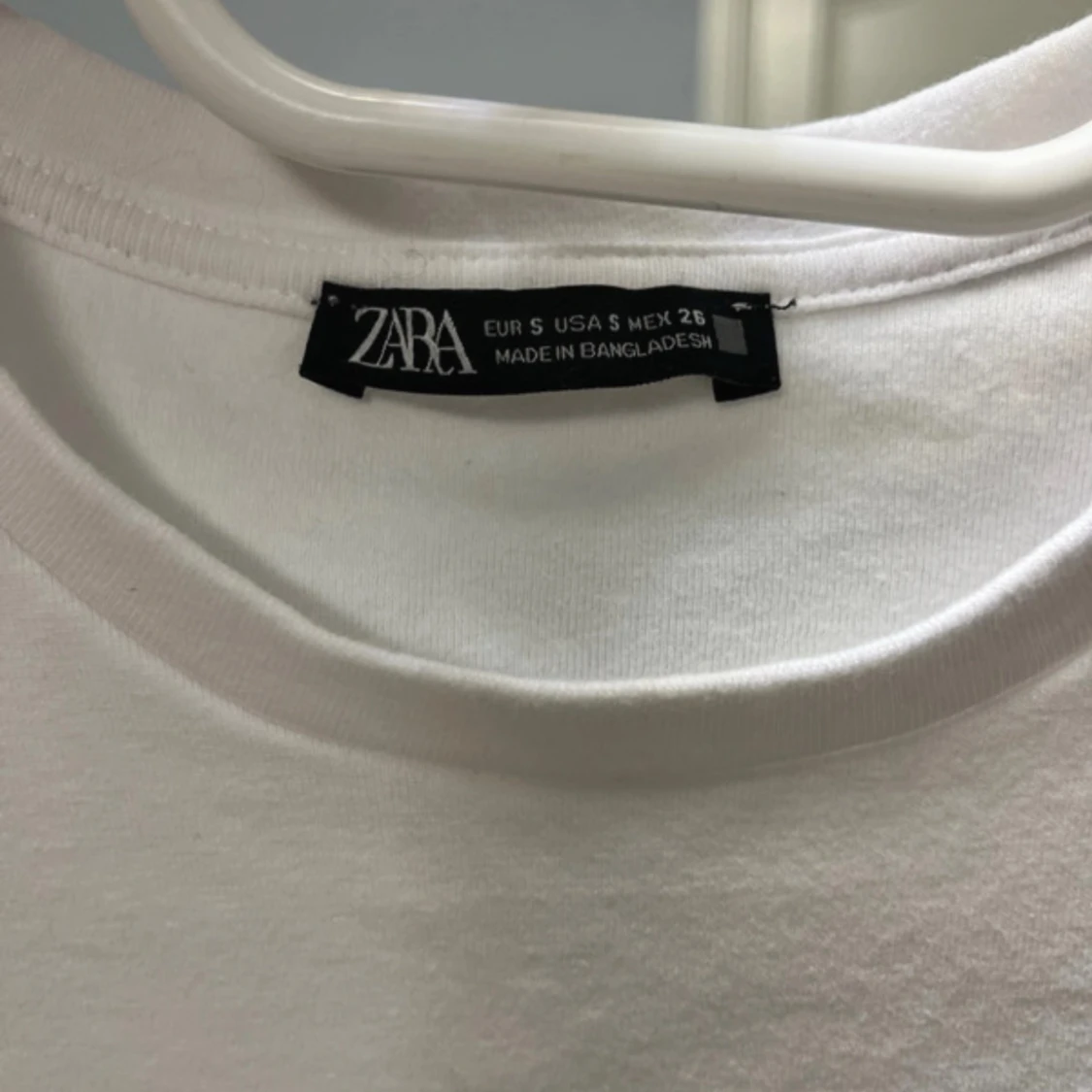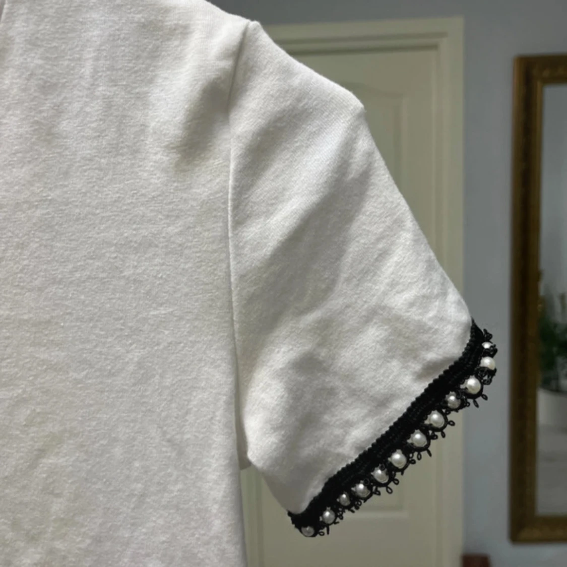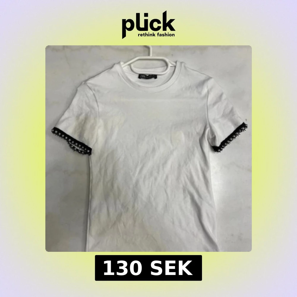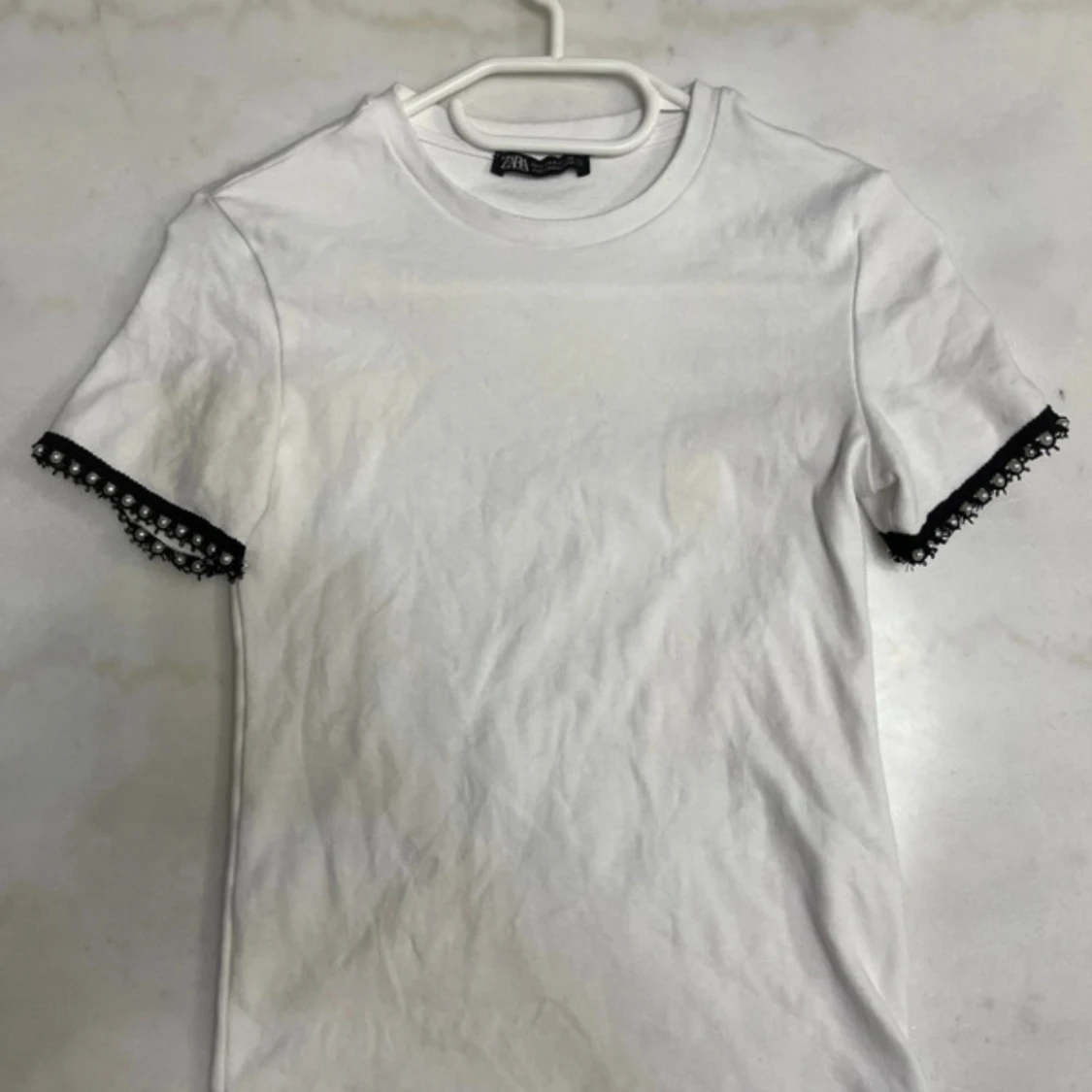 Vit t-shirt från Zara i bomull med korta ärmar. Ärmsluten har svarta spetsdetaljer och pärlor som ger en unik och cool touch. Perfekt för dig som vill ha något enkelt men ändå med en twist.