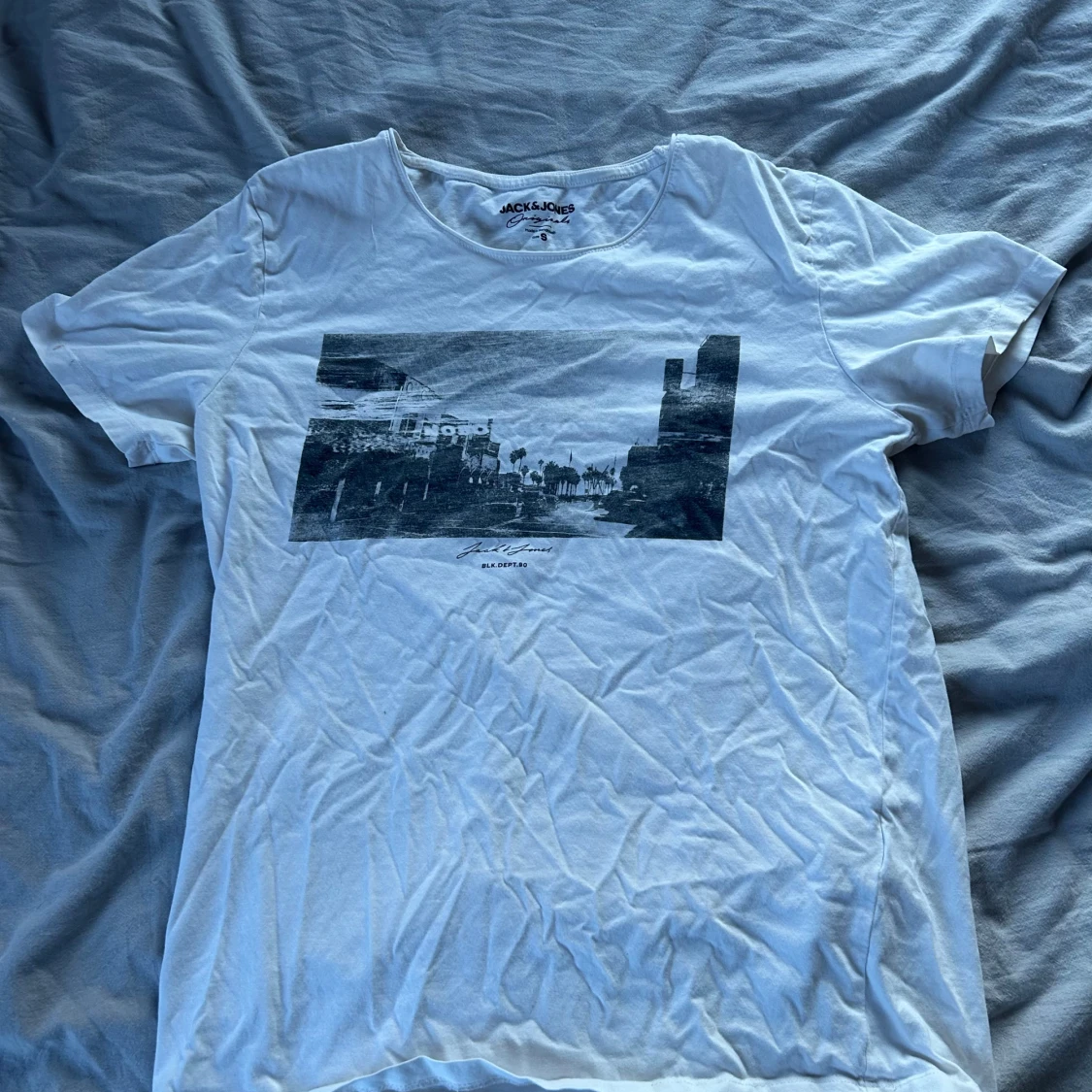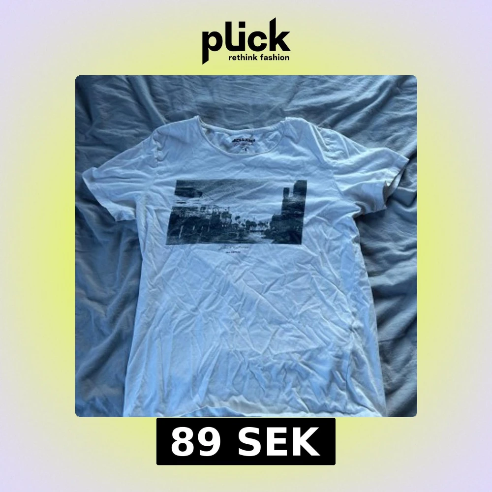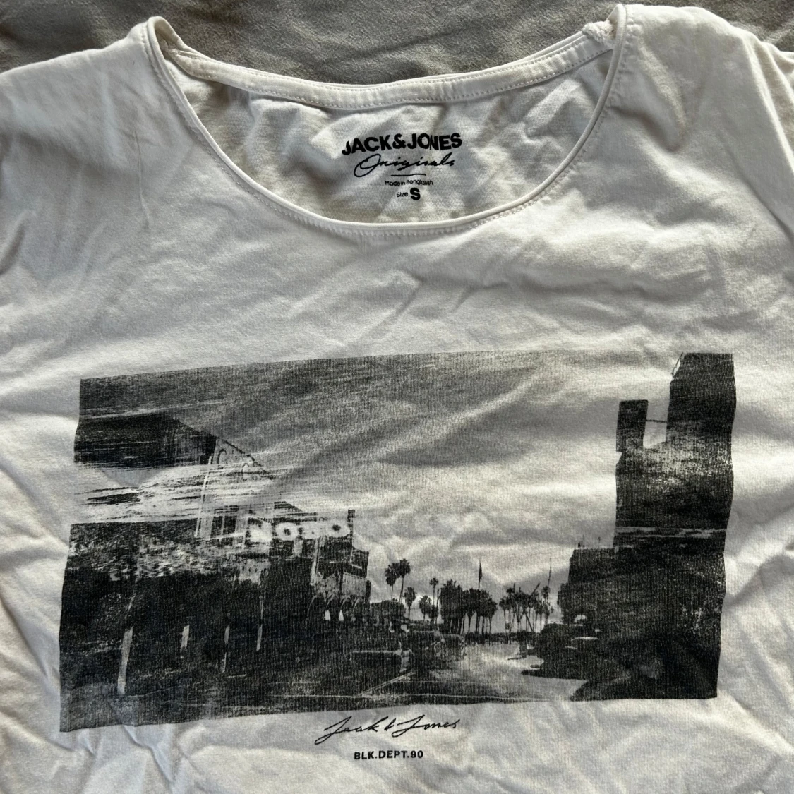 Vit t-shirt från Jack & Jones med svartvit grafiskt print framtill. Sparsamt använd, storlek s