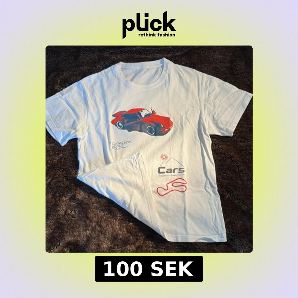 Vit t-shirt med tryck av en röd sportbil och texten 'A Collection about Cars'. T-shirten har rund hals, korta ärmar och en rak passform. Materialet är mjuk bomull och trycket har coola racing-vibbar. Perfekt för dig som gillar bilar och streetstyle. Modellen är 179 65kg så skulle säga att det är en S/M