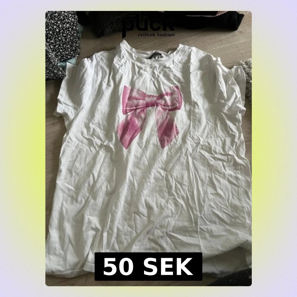 Säljer en vit t-shirt från New yorker med en stor rosa rosett framtill. T-shirten har korta ärmar och rund hals. Perfekt för dig som gillar söta detaljer och vill ha en enkel men ändå unik look.