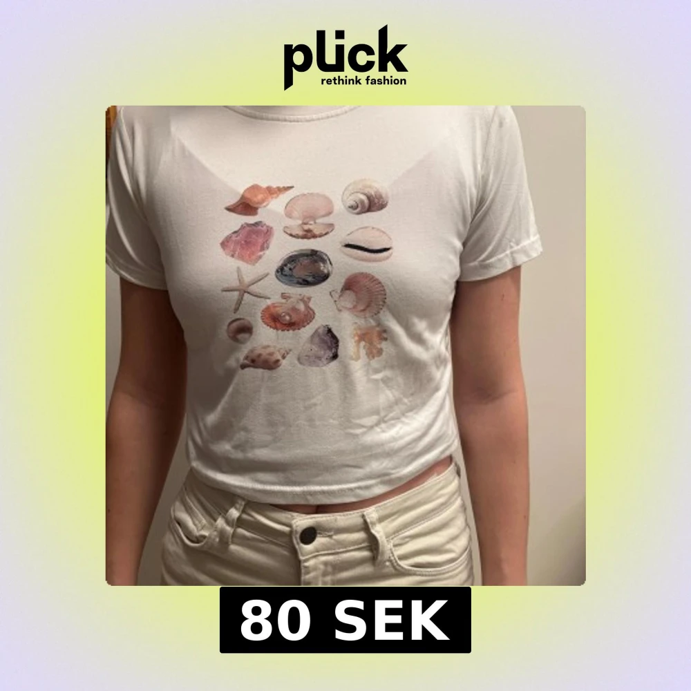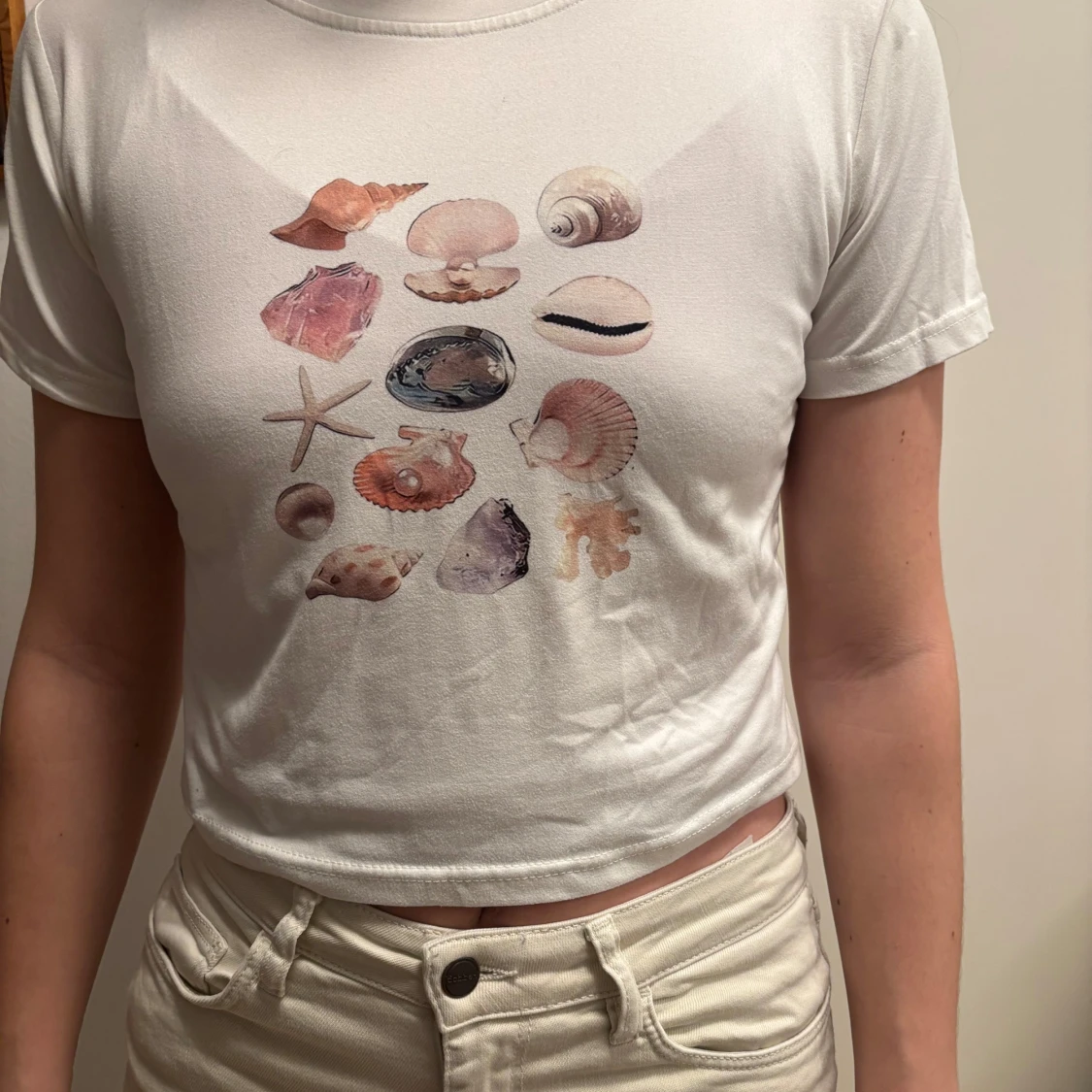 Säljer en vit t-shirt med ett färgglatt snäckmotiv på framsidan. T-shirten är kortärmad och har en croppad passform, mjukt material