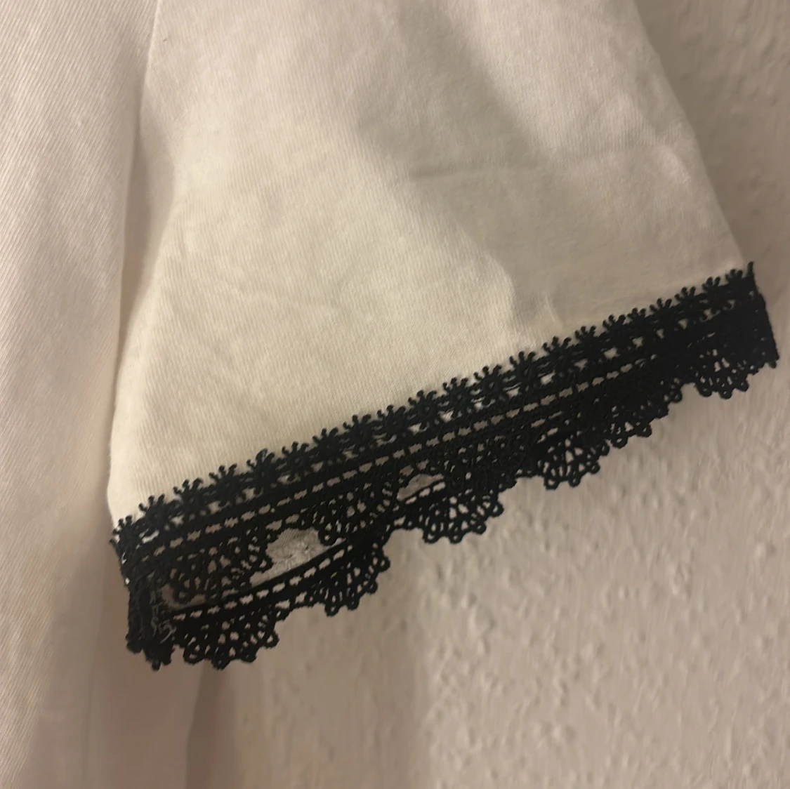 Vit t-shirt från Zara i mjuk bomull med korta ärmar. Ärmsluten har snygga svarta spetsdetaljer som ger en cool kontrast och unik touch. Perfekt för dig som gillar stilrena plagg med en twist.