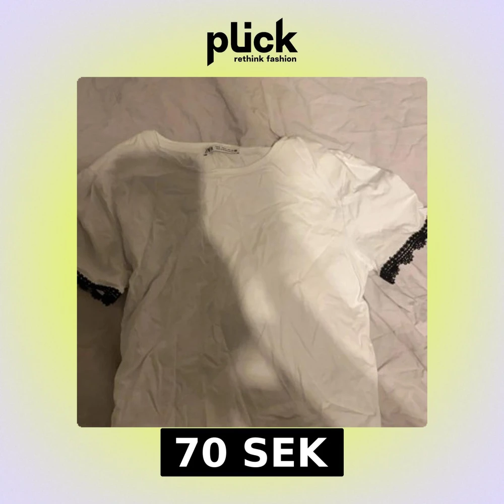 Säljer en stilren vit t-shirt från Zara med svarta spetsdetaljer vid ärmsluten. T-shirten är kortärmad och gjord i ett mjukt material.