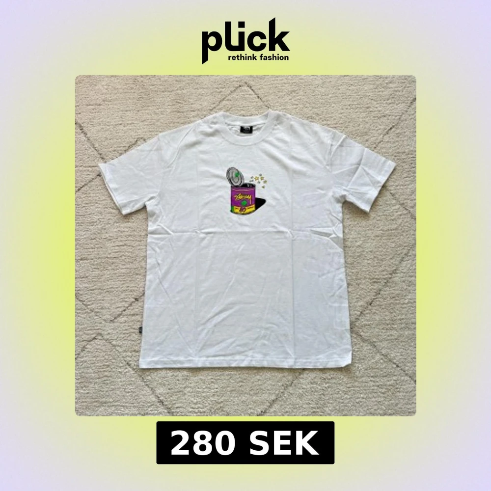 Vit t-shirt från Stüssy med ett färgglatt tryck av en konservburk och stjärnor på bröstet. Klassisk passform och rund halsringning. Perfekt för dig som gillar streetwear och vill sticka ut med en unik design.