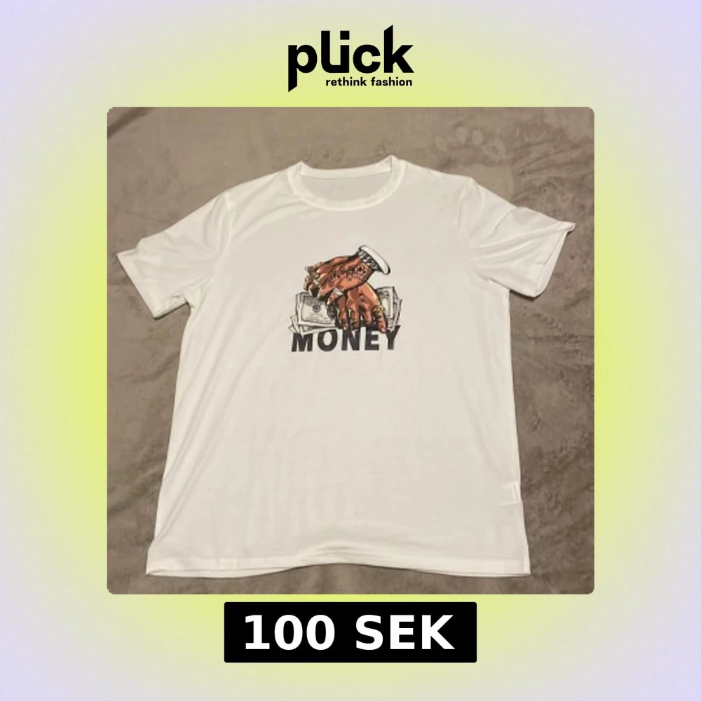 Säljer en vit t-shirt med ett coolt tryck av en hand som håller pengar och texten 'MONEY'. Perfekt för en avslappnad stil. T-shirten har korta ärmar och en rund halsringning.