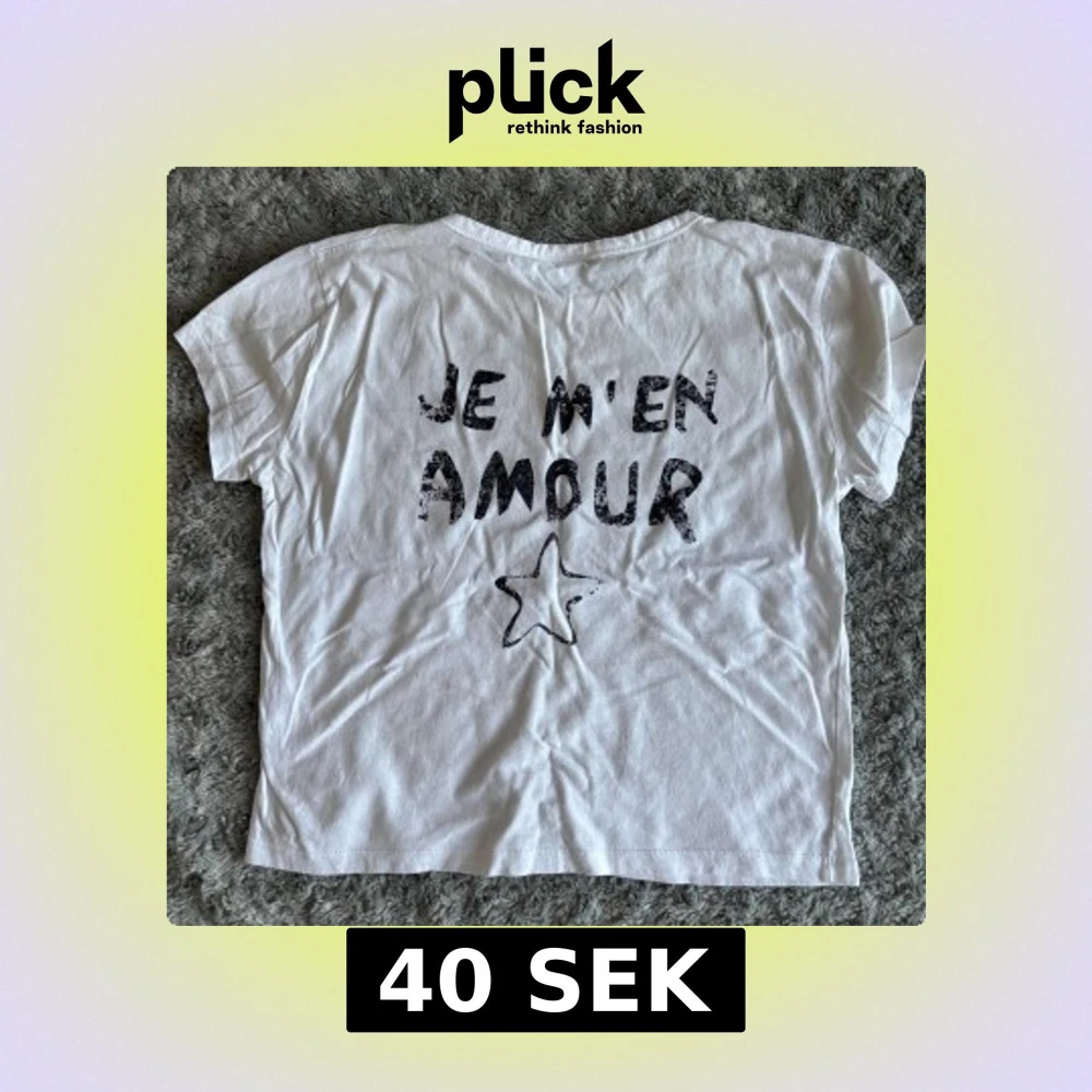 Vit t-shirt från Gina Tricot med svart texttryck 'JE M'EN AMOUR' i storlek 158/164. Inte använd många gånger och i fint skick!🤍