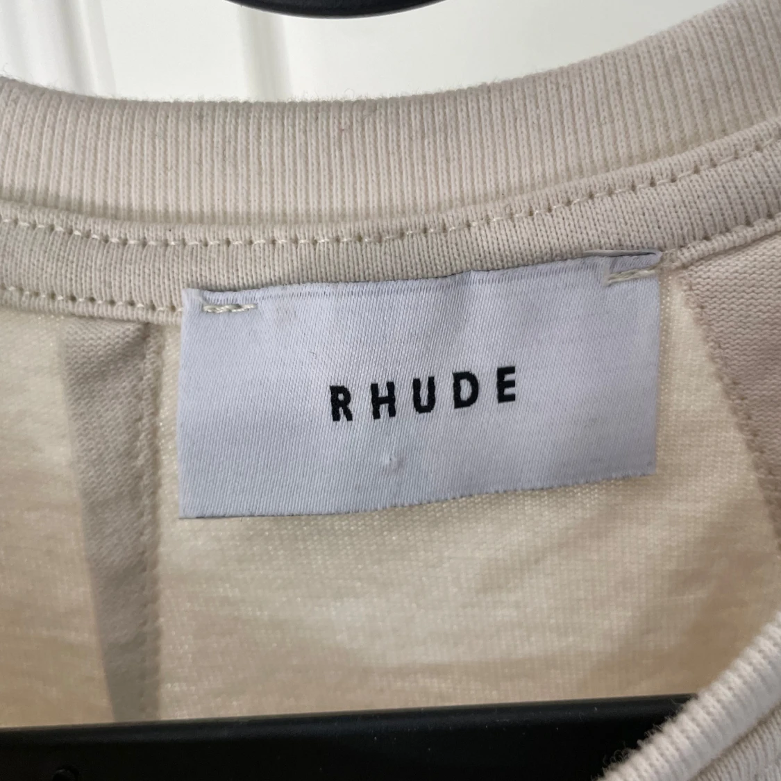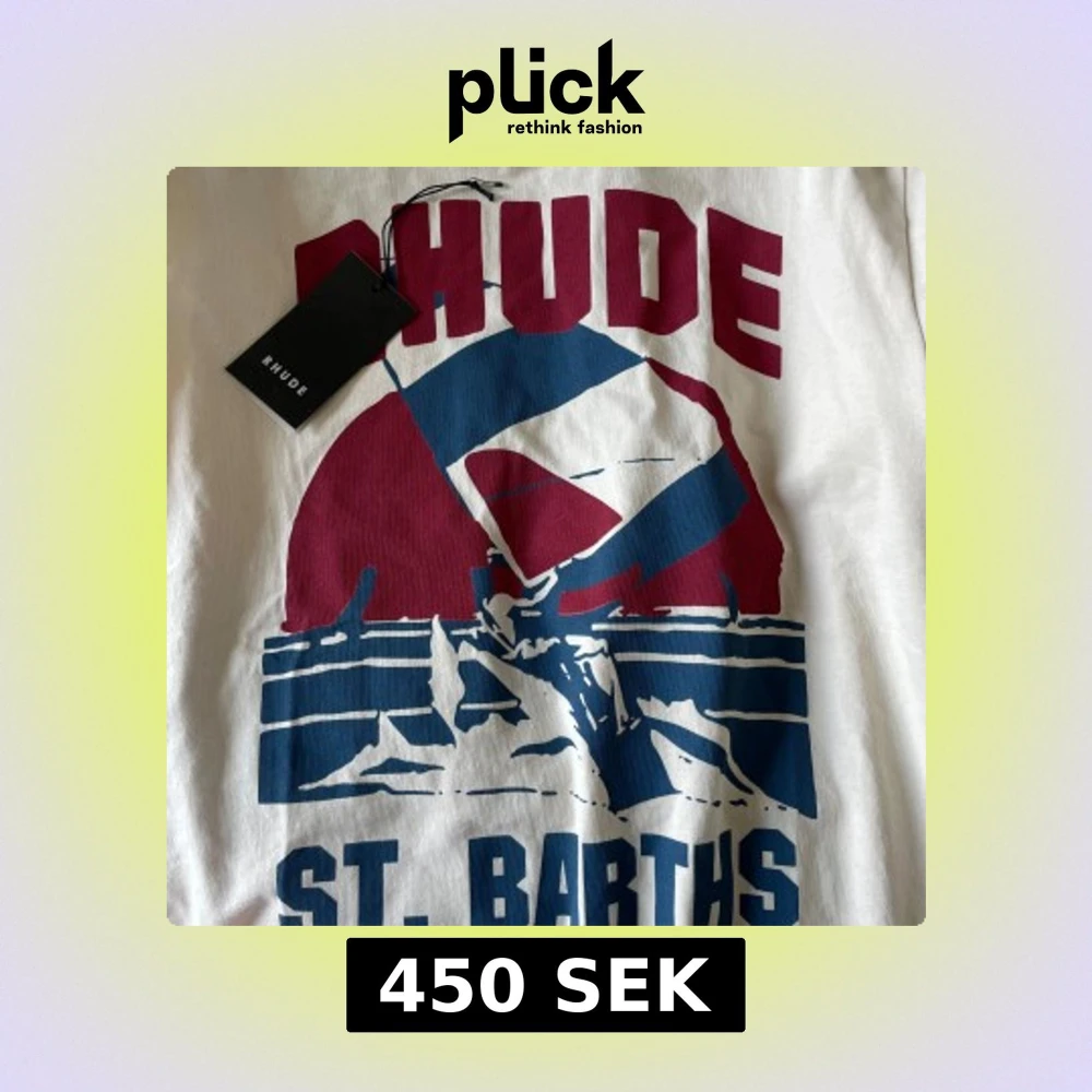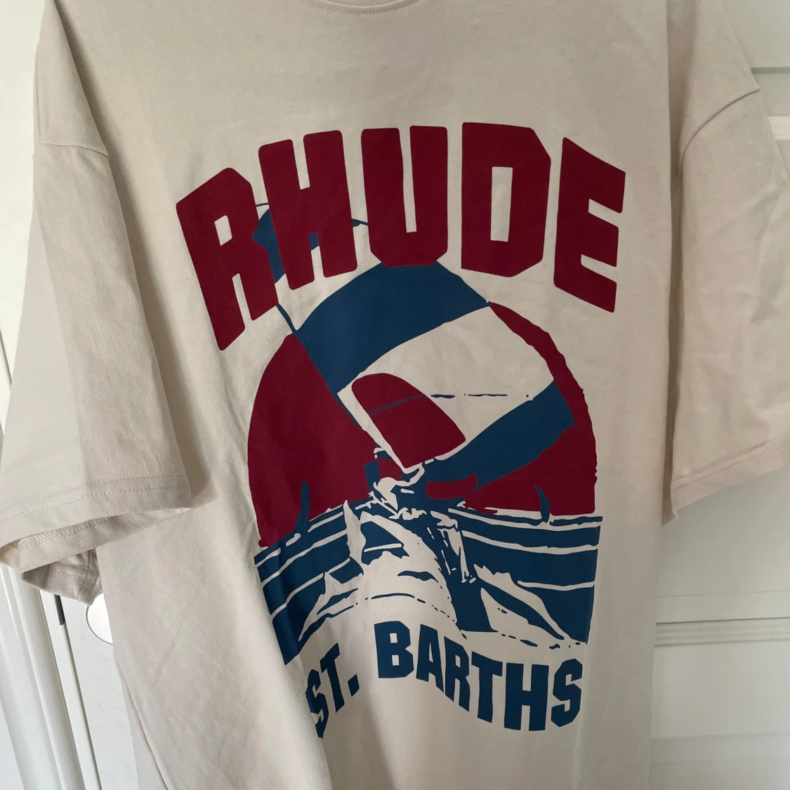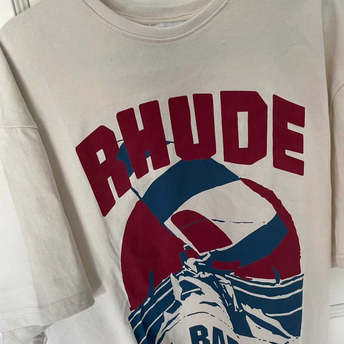 Snygg vit t-shirt från Rhude med stort grafiskt tryck i rött och blått framtill. med klassisk rund hals och korta ärmar. Perfekt statement-plagg för dig som gillar streetwear och coola prints.