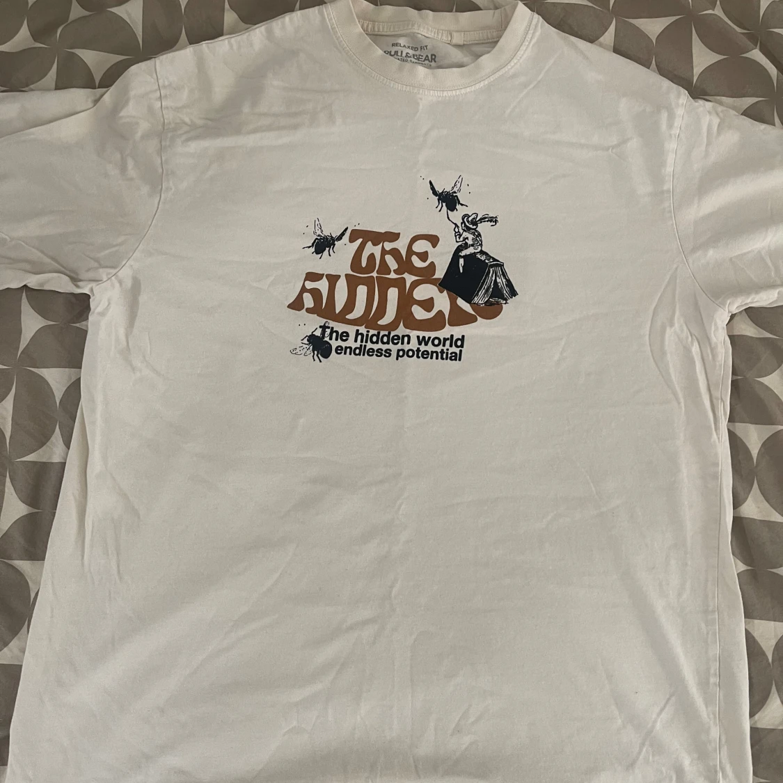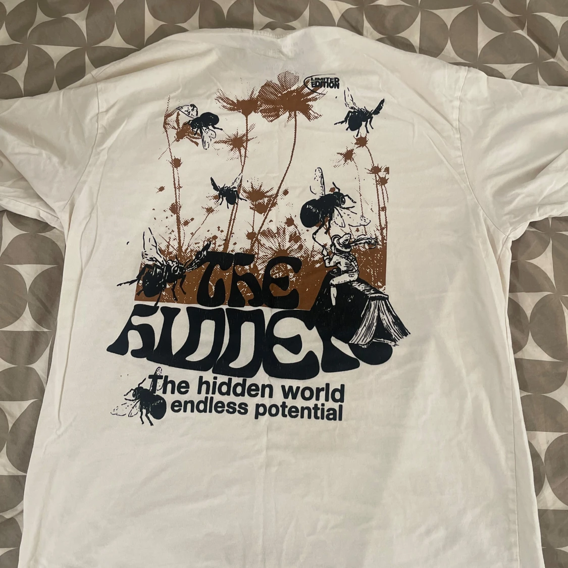 Säljer en vit t-shirt från The Editor med ett coolt tryck på både fram- och baksidan. Texten 'The Hidden World Endless Potential' och grafiska element ger en unik look. Perfekt för dig som vill sticka ut! Vid snabbaffär kan priset diskuteras
