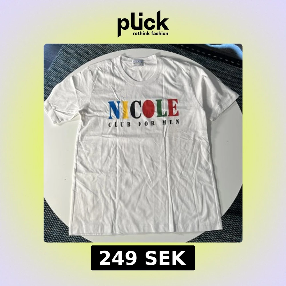 Vit t-shirt från Nicole Club for Men med färgglatt tryck på bröstet i blått, gult, svart, rött och grönt. Klassisk rund hals och korta ärmar. Tillverkad i mjuk bomull, perfekt för en clean och stilren look. Liten fläck, går nog bort i tvätt