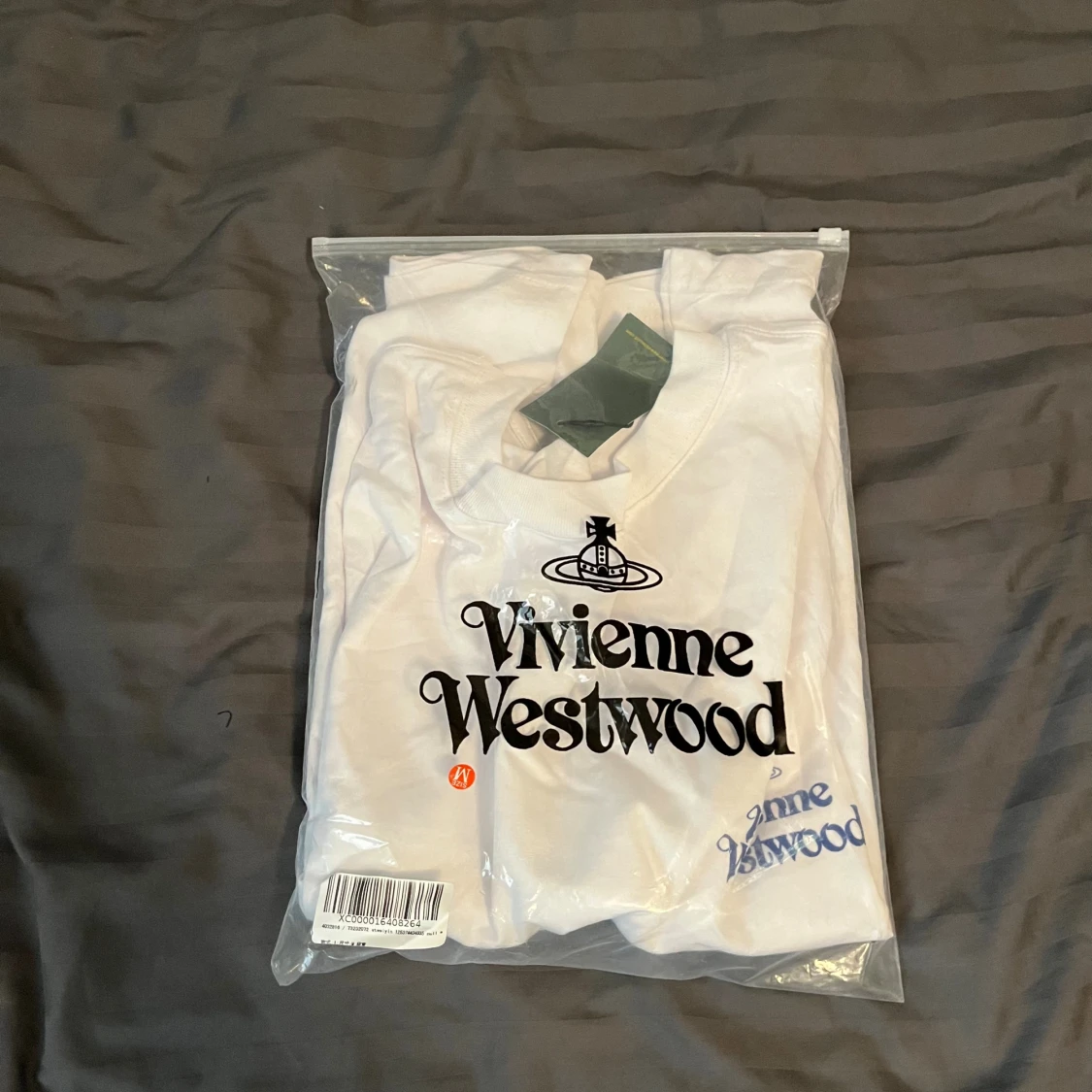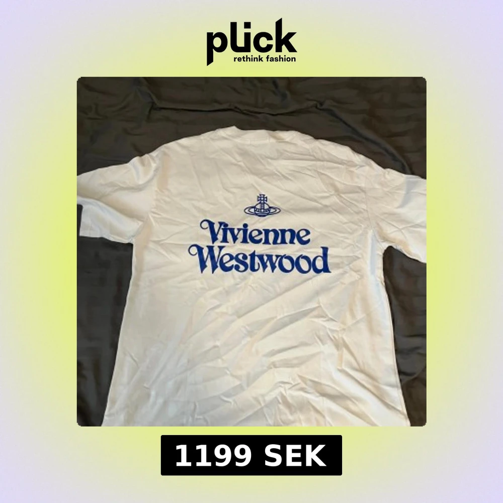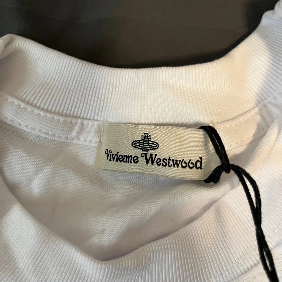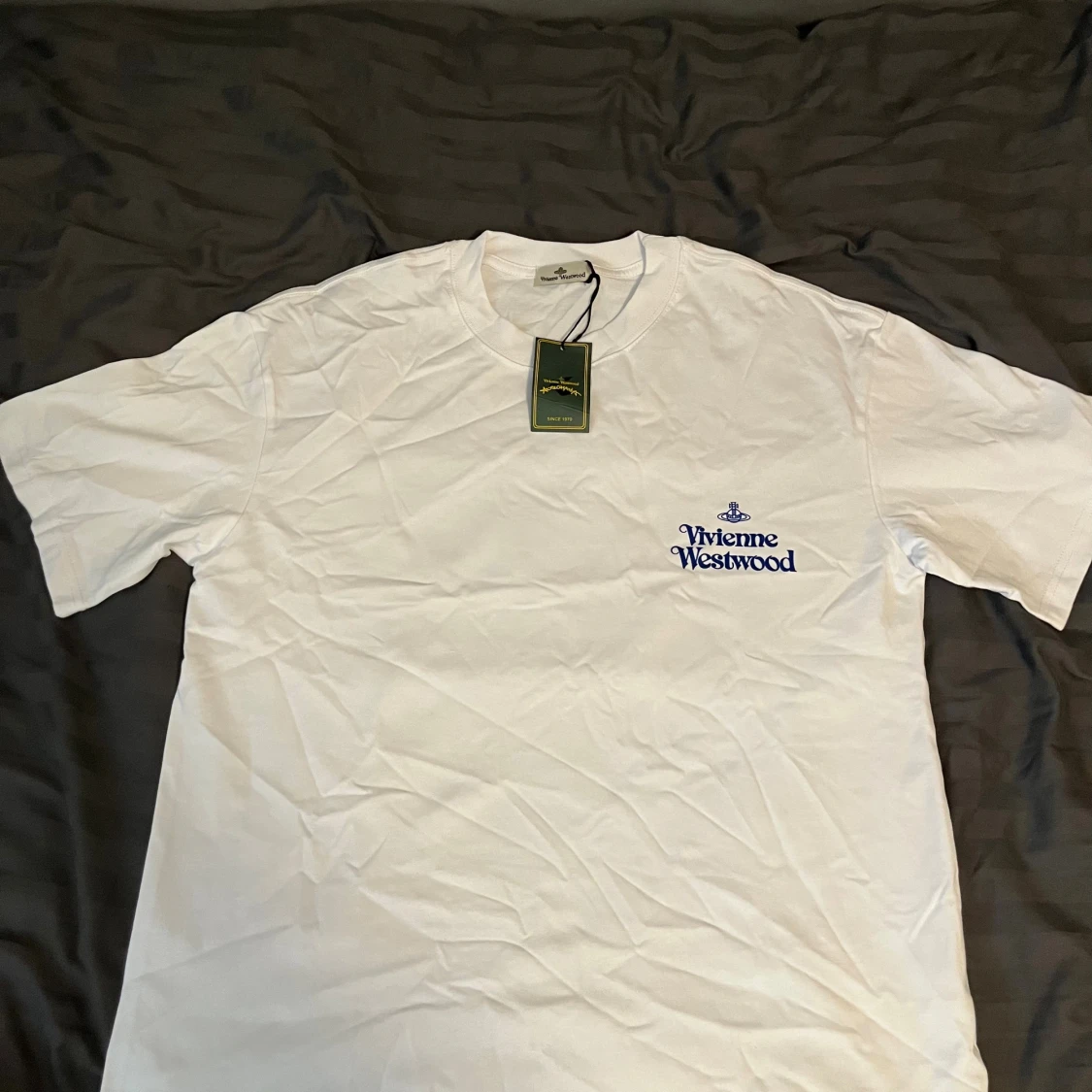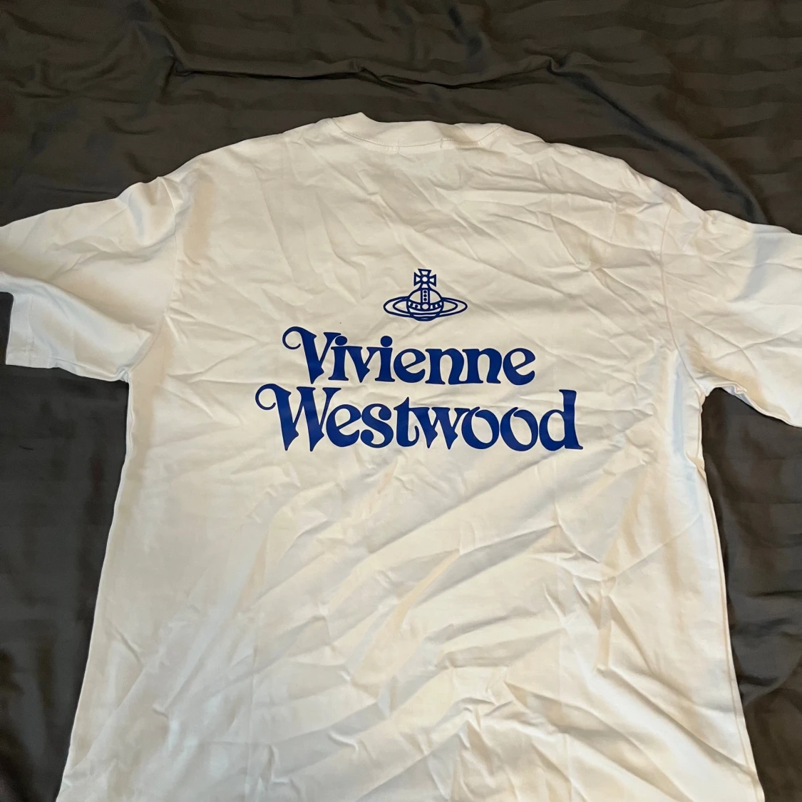 Vit t-shirt från Vivienne Westwood med blå logga och text både fram och bak. Klassisk rund halsringning och korta ärmar. Storleken är M i en boxig modell. Kan gå lägre vid snabb affär.