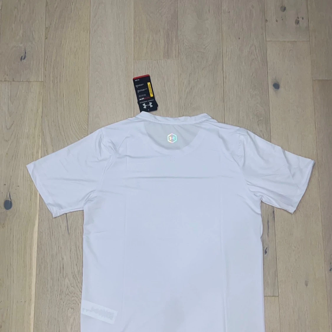 Fräsch vit t-shirt från Under Armour med klassisk logga på bröstet. Tillverkad i lätt och snabbtorkande syntetmaterial, perfekt för träning. T-shirten har korta ärmar och en normal passform. Snygg och sportig look för dig som gillar att hålla dig aktiv.