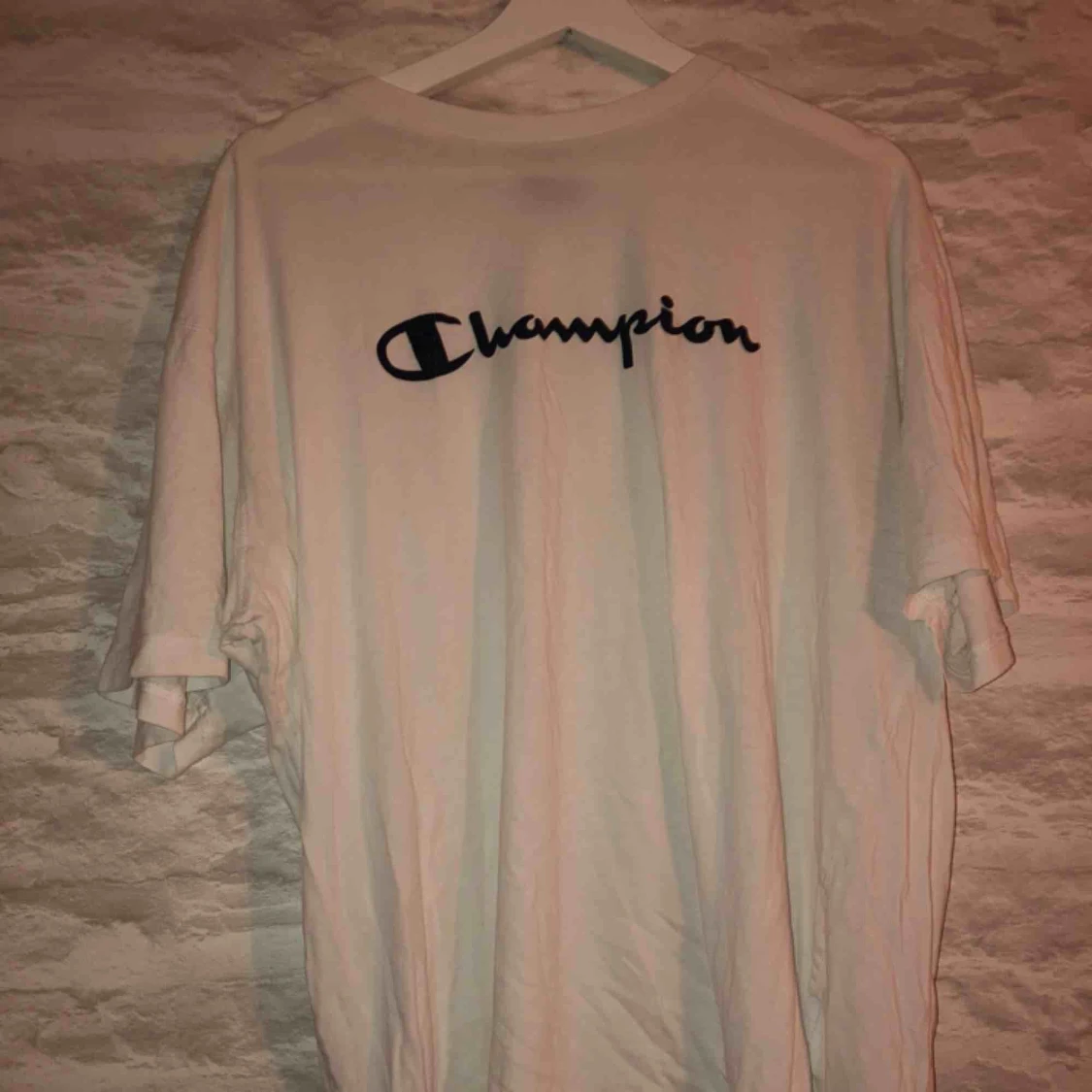 Vit champion t-shirt i storleken XXL men sitter som en L. Köparen står för frakten.