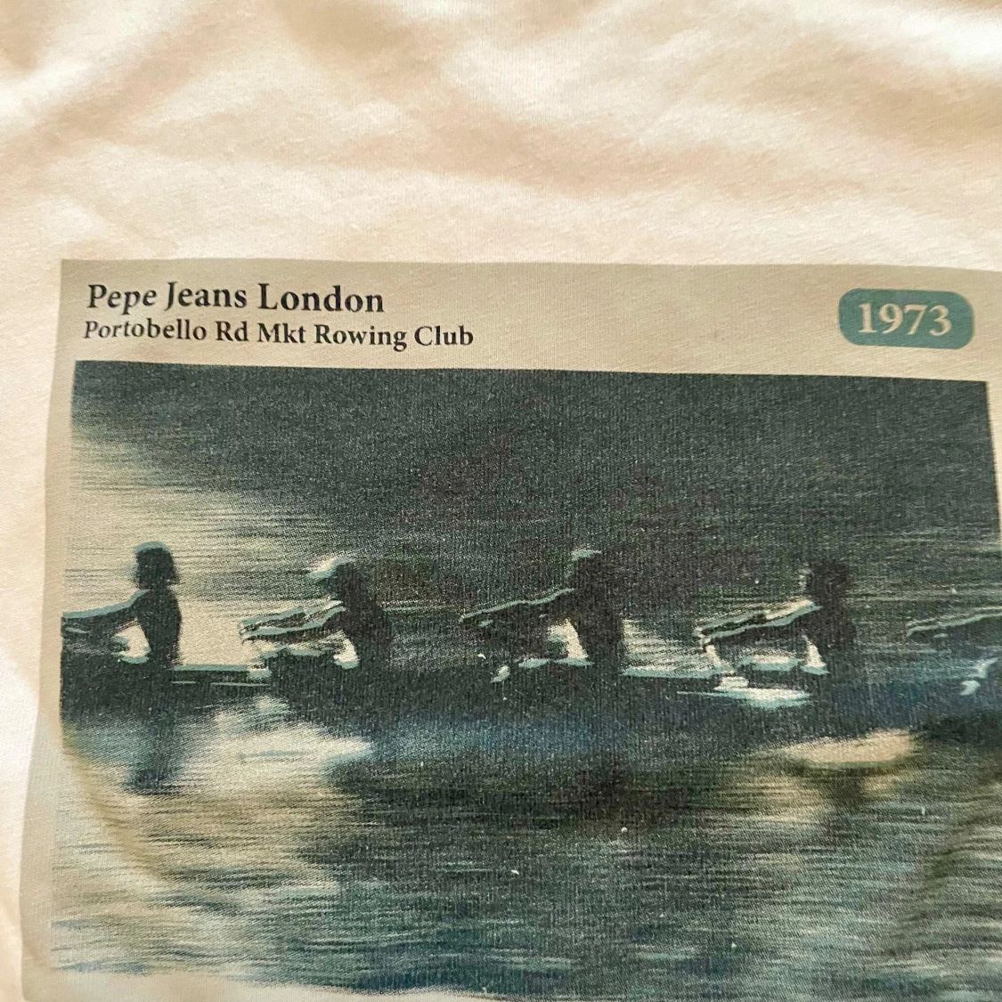 Säljer en vit t-shirt från Pepe Jeans London med ett tryck av roddare och texten 'Portobello Rd Mkt Rowing Club 1973'. T-shirten har en slim passform och är kortärmad. Perfekt för en avslappnad stil.