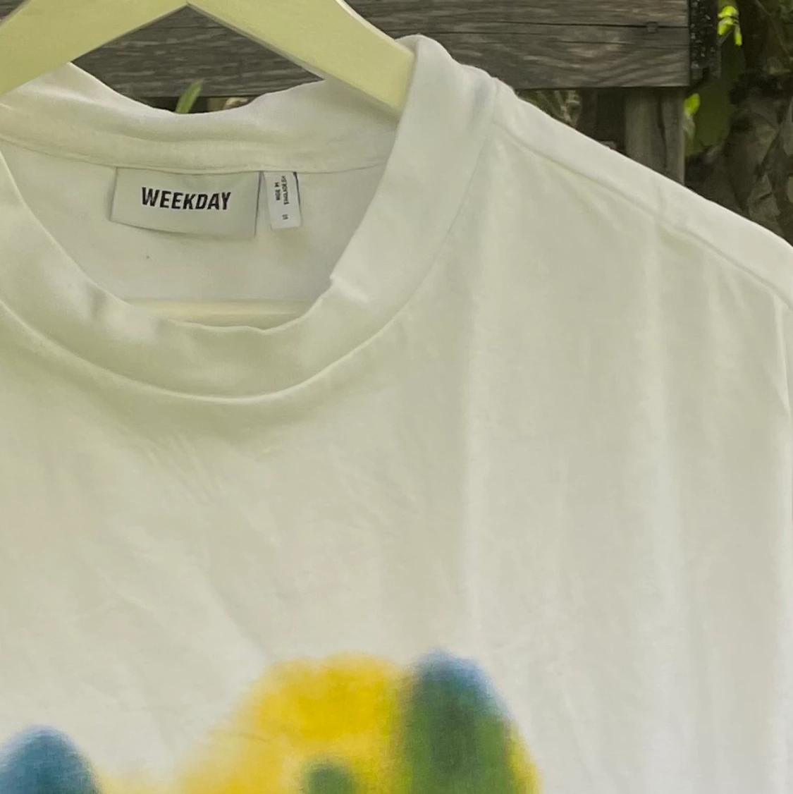 Vit t-shirt med en najs hund på från weekday😊 Kolla in mina andra produkter (frakten blir inte mer än 66kr )