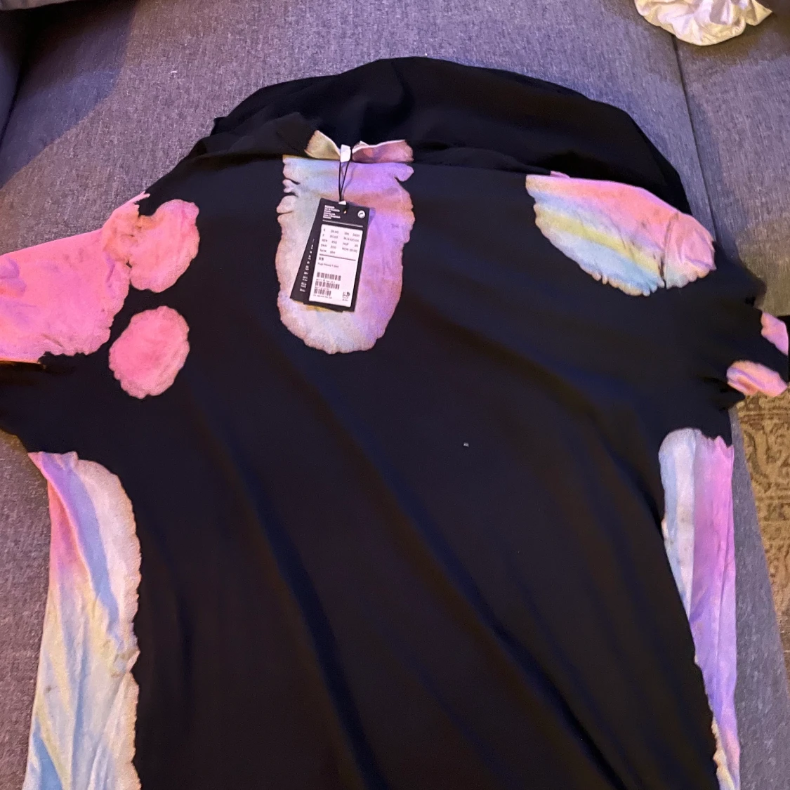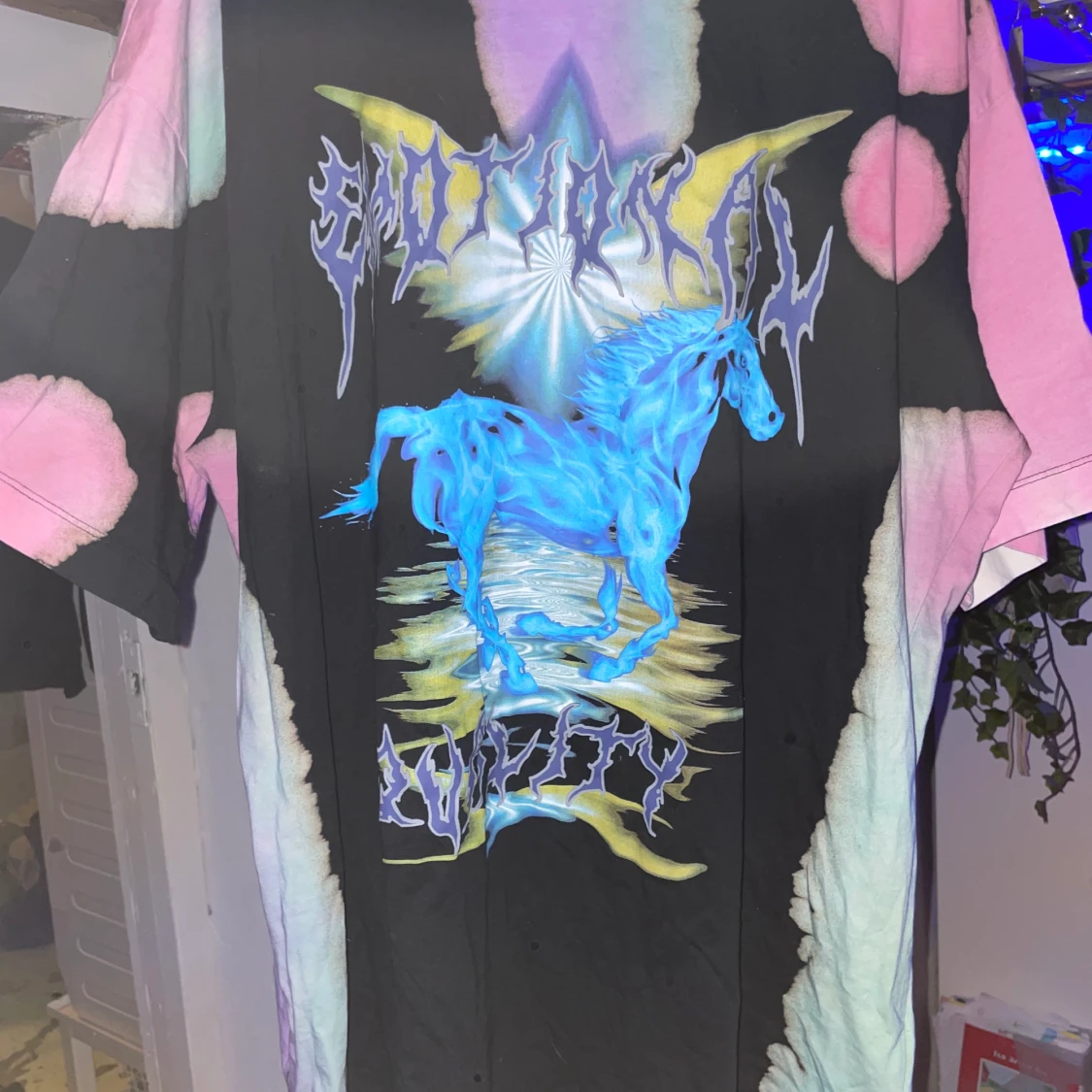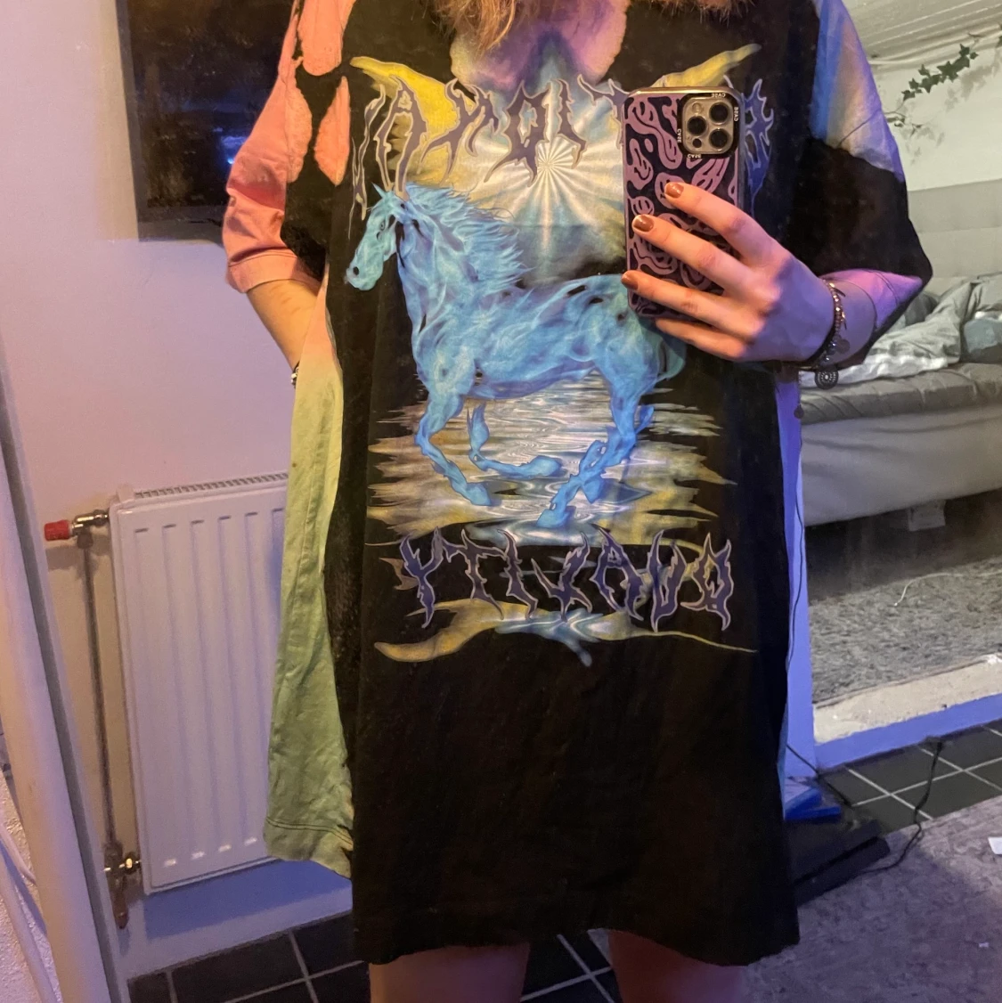 T-shirten på ett ungefär till mina knän då jag är 166, den har som små färg fläckar lite här och där med en blåflämmad häst, samt text över och under hästen. Armarna är går precis över armvecket, och är lite tajtare runt halsen. Har aldrig använt den då prislappen dessutom är kvar.